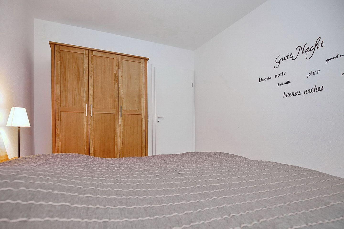 Auch das schöne Schlafzimmer ist mit natürlichen Möbeln wohnlich eingerichtet. Es erwarten dich hier ein Doppelbett mit hochwertigen Matratzen (2 x 90 x 200 cm) und ein geräumiger Kleiderschrank. Am Fenster befindet sich ein Verdunklungsrollo. Die Böden sind im Wohn- und Schlafbereich mit Laminat ausgelegt.