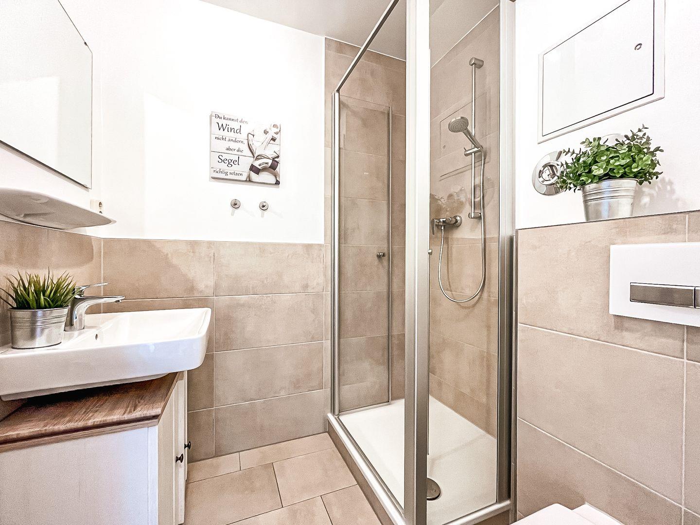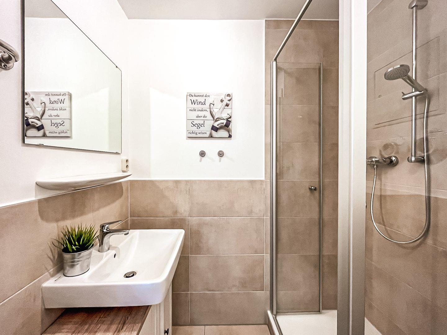 Auch ein gefliestes Duschbad steht zur Verfügung. In dieser Nichtraucherwohnung sind Haustiere nicht erlaubt.