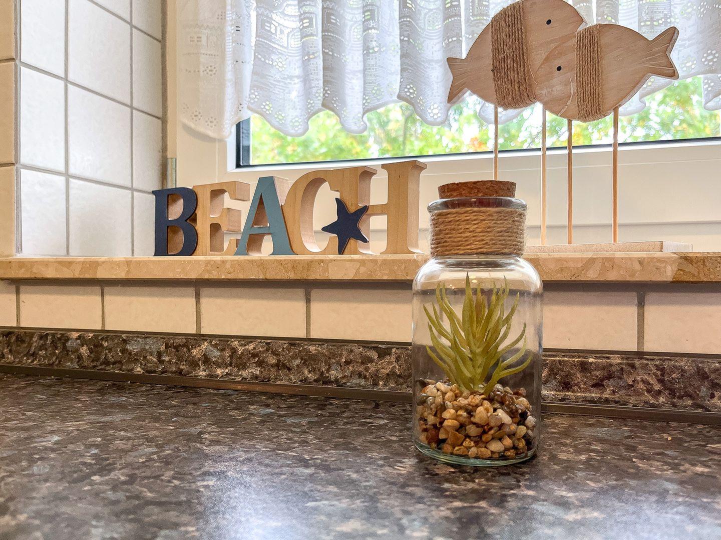 Die Küche liegt separat und verfügt neben ausreichend Geschirr, über einen 4-Plattenkochfeld mit Backofen und einen Kühlschrank mit Gefrierfach. Hier gibt es auch einen kleinen Essbereich für zwei Personen.