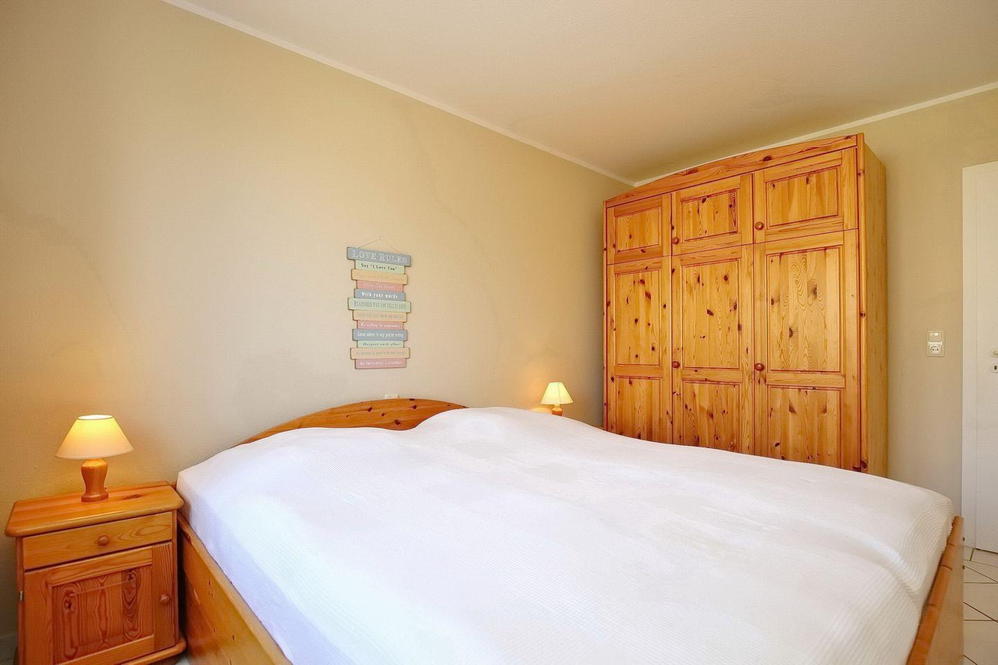 Das Schlafzimmer ist mit einem Doppelbett (2 x 90 x 200 cm) und einem großen Kleiderschrank für die persönlichen Dinge ausgestattet. Vorhänge am Fenster dienen zur Verdunkelung. In der gesamten Wohnung ist der Boden gefliest.