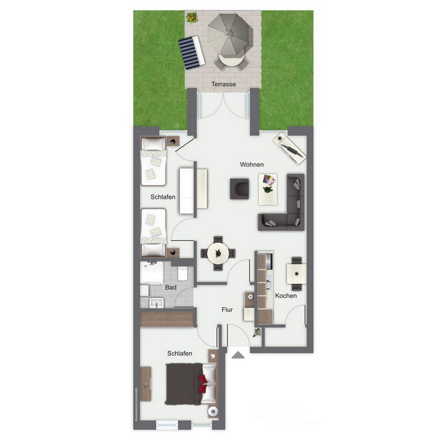 Die gemütliche ca. 63 m² große 3-Zi.-Wohnung liegt im Erdgeschoss mit einem eigenen Strandkorb auf der Terrasse. Du bewohnst einen Wohn-/ Essbereich, eine Küchenzeile, zwei Schlafzimmer und ein Duschbad. Die Entfernung zum Strand von der Ferienanlage Sünnslag beträgt ca. 400 m.