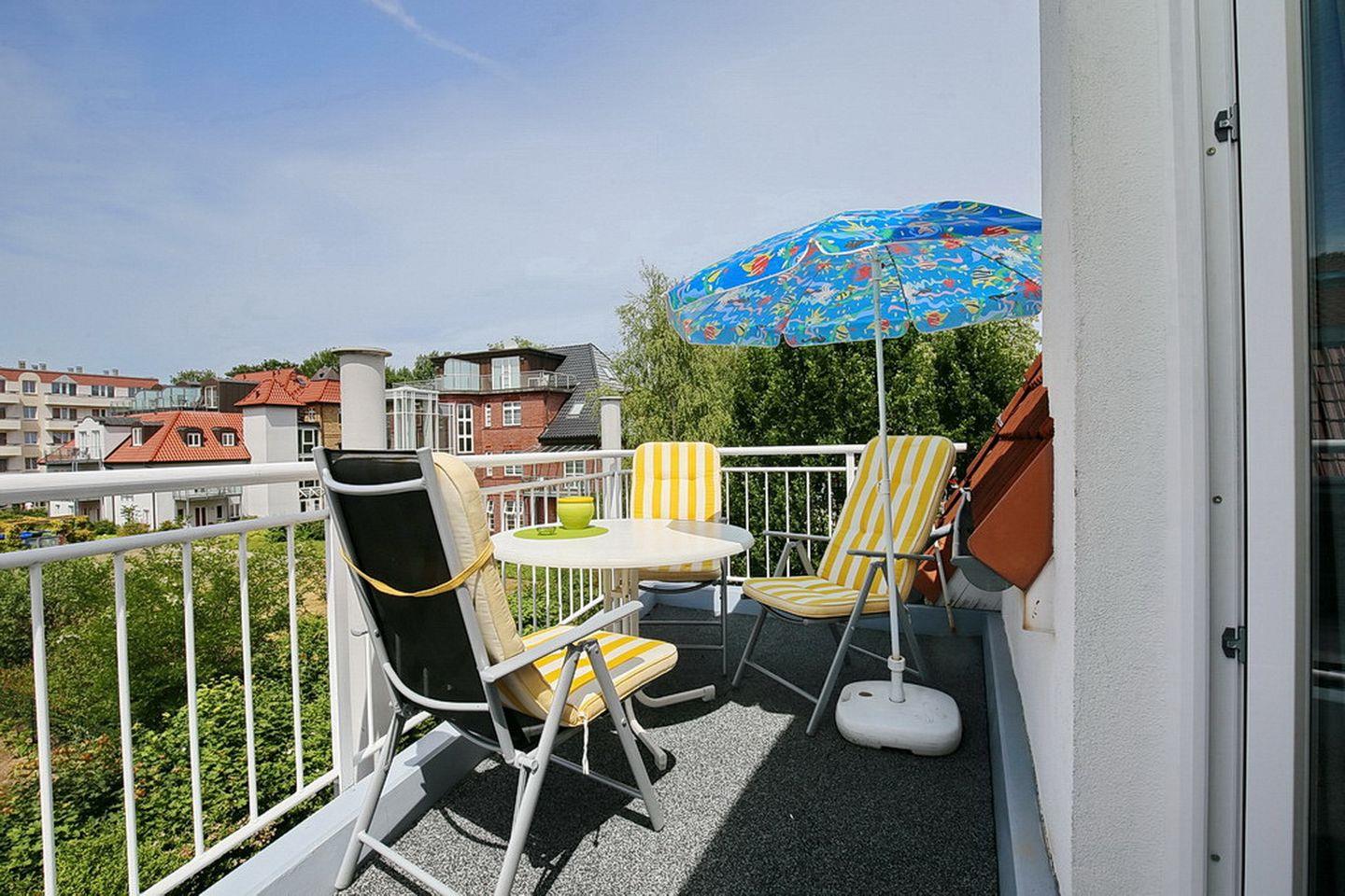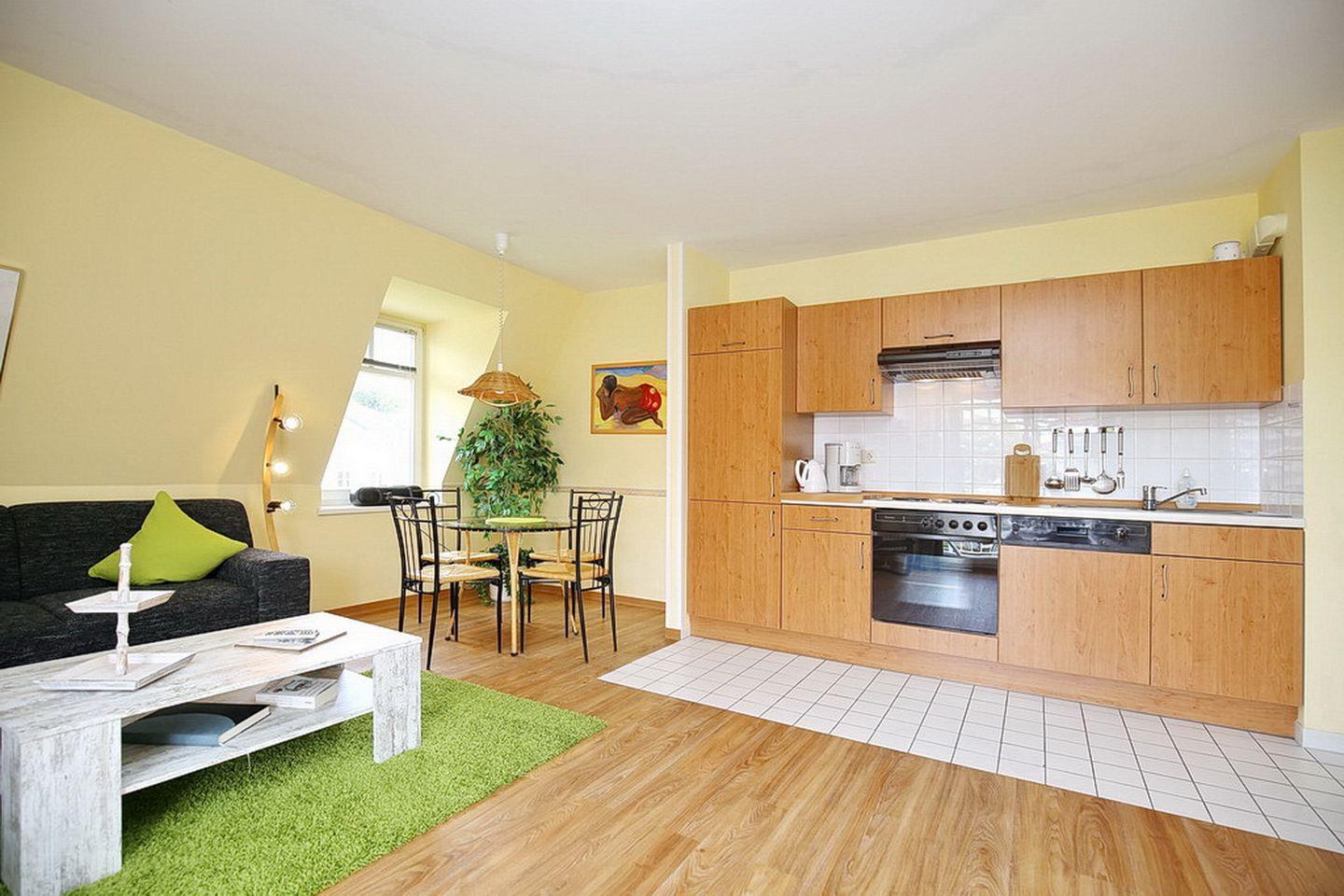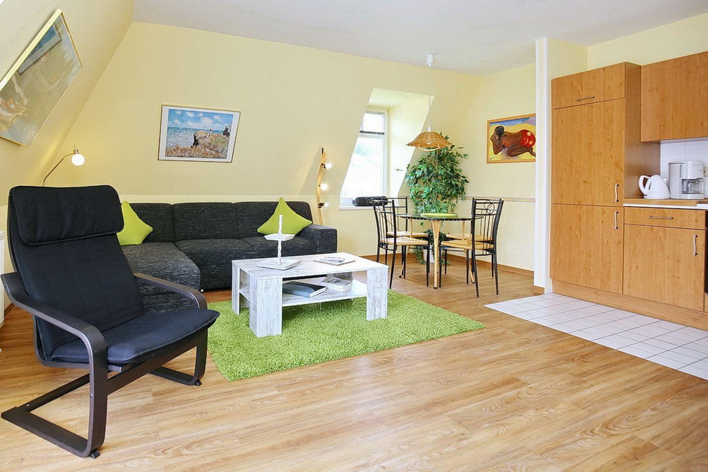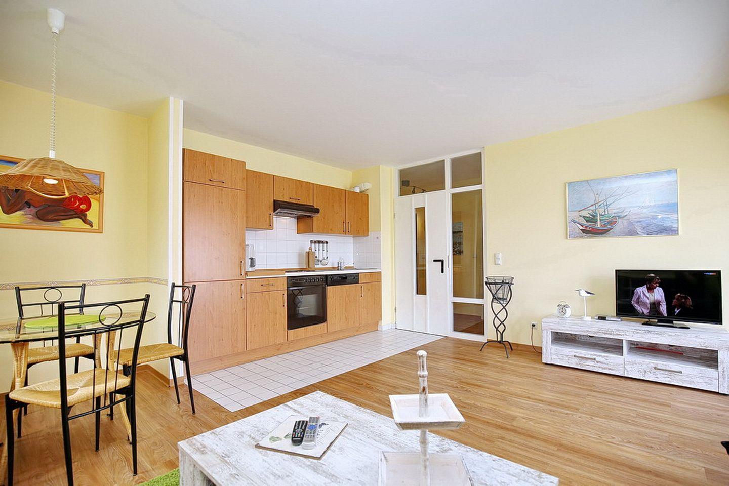 Auf ca. 57m² bietet die Wohnung im 2. Obergeschoss ein Wohnzimmer, die Küchenzeile im Wohnbereich, ein Schlafzimmer und einen Balkon in Richtung Westen. Die Strandentfernung beträgt ca. 70 Meter.