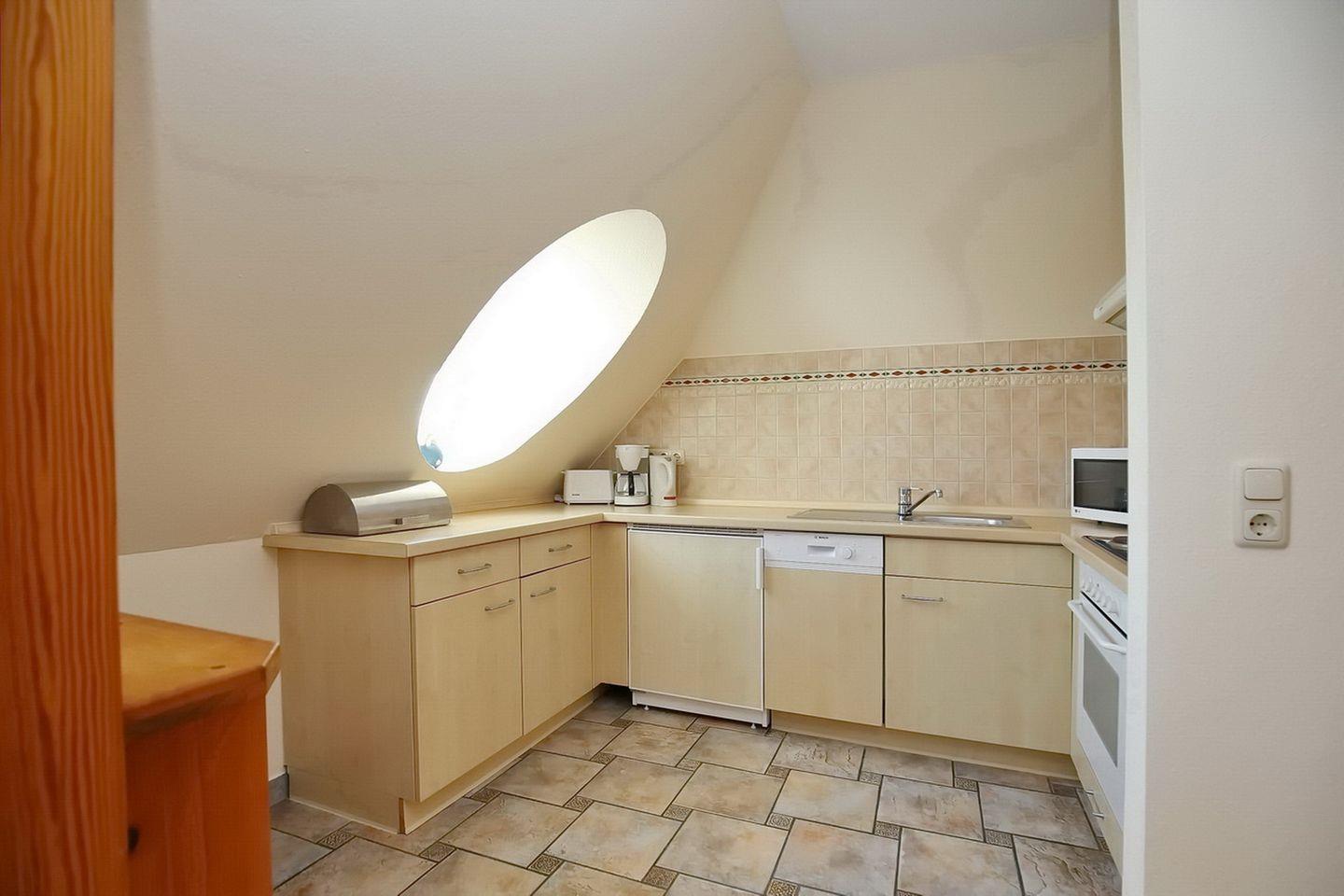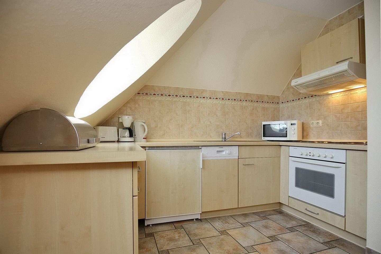 In der hellen Küchenzeile kann ein Kühlschrank mit Gefrierfach, eine Mikrowelle, ein Backofen und ein 4- Plattenkochfeld genutzt werden.