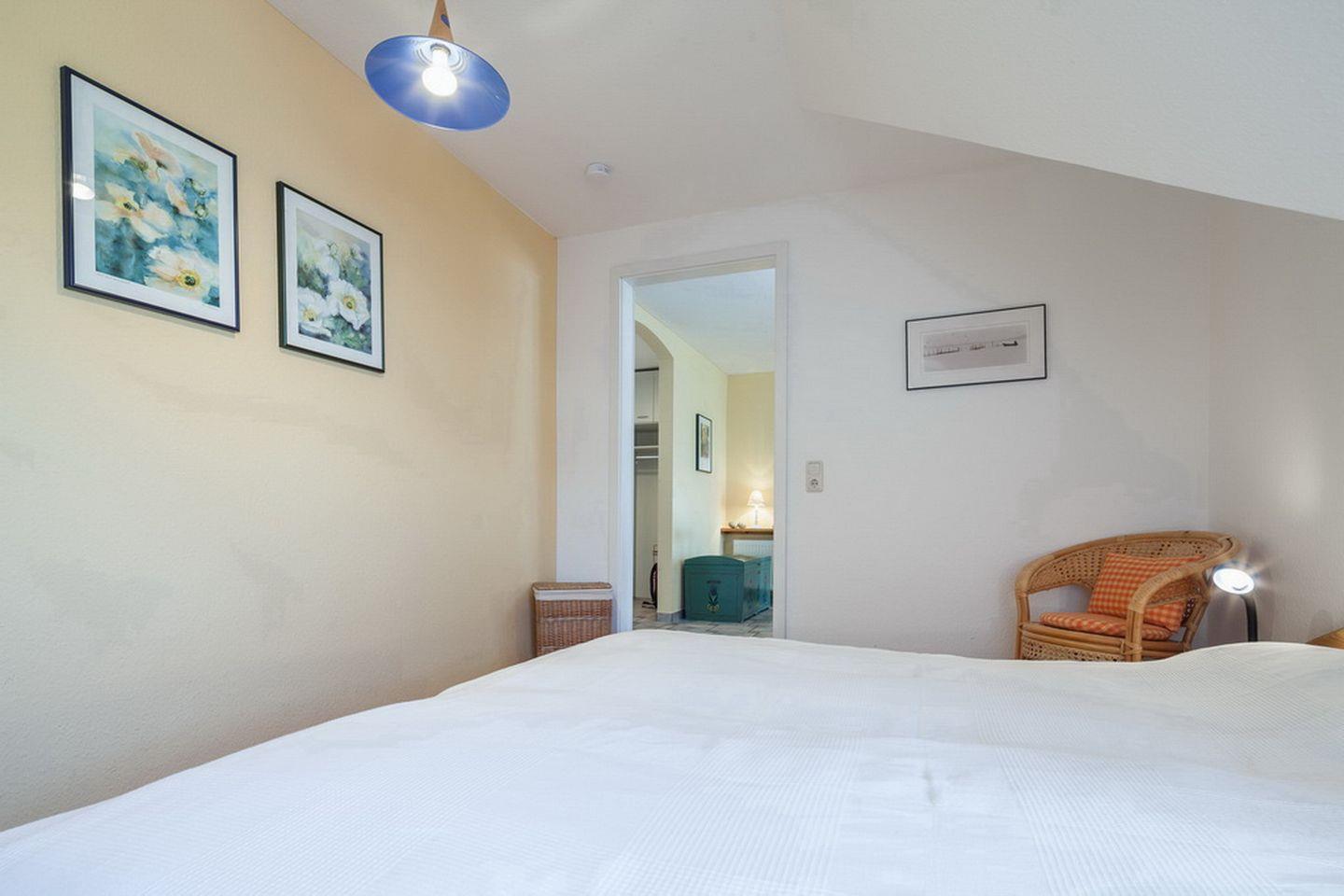 Im Schlafzimmer sorgt ein Doppelbett (2 x 90 x 200 cm) für erholsamen Schlaf. Ein großer Kleiderschrank bietet Stauraum für die Urlaubsgarderobe. Zur Verdunkelung sind Rollos an den Fenstern angebracht.