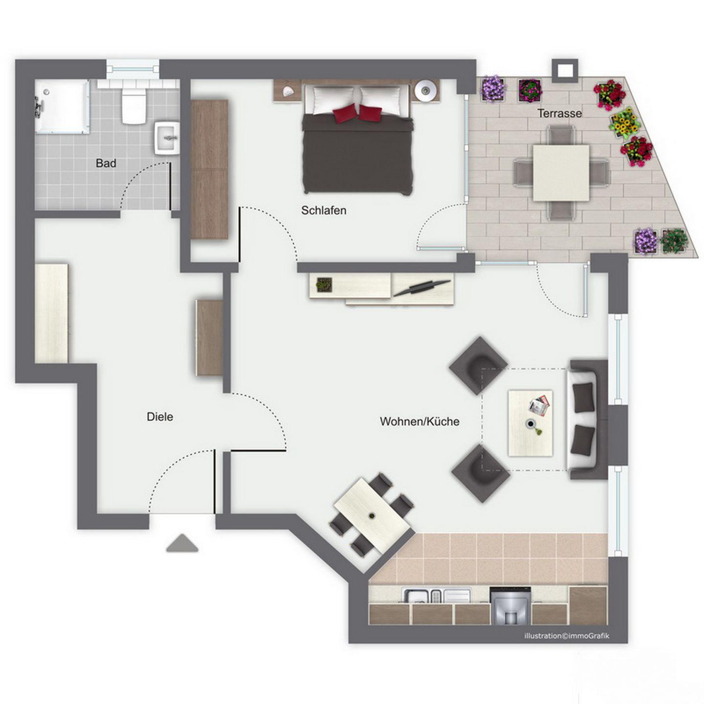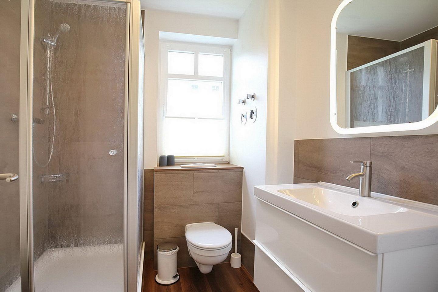 Die voll ausgestattete, geflieste Küchenzeile verfügt über ausreichend Geschirr, Geschirrspüler, Mikrowelle, ein 4-Platten-Cerankochfeld mit Backofen, Kühlschrank mit Eisfach, Dunstabzugshaube, Kaffeemaschine, Wasserkocher, Toaster und vieles mehr. In unmittelbarer Nähe der Küchenzeile befindet sich der Essplatz für 4 Personen. Ein gefliestes Duschbad ist selbstverständlich vorhanden.