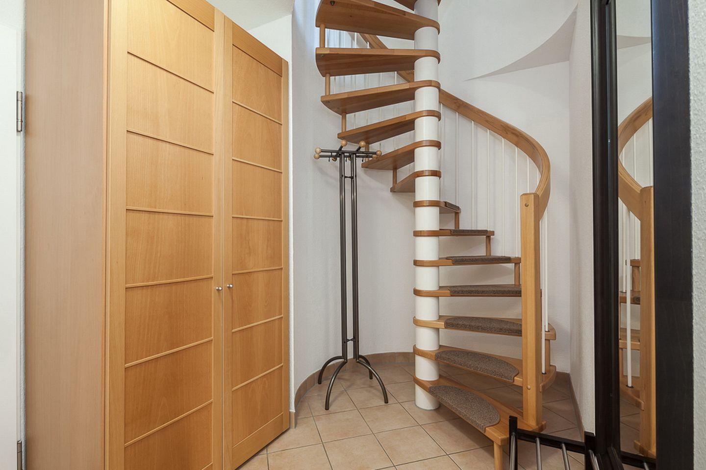 Die obere Ebene erreichst du über eine Wendeltreppe. Hier befinden sich zwei Schlafzimmer, die mit Teppichboden ausgelegt sind. Im ersten Schlafzimmer verspricht ein Doppelbett (2 x 90 x 200 cm) erholsamen Schlaf. Ein großzügiger Kleiderschrank bietet viel Platz für deine Urlaubsgarderobe. Ein zweiter Flachbildfernseher ist hier ebenfalls vorhanden. Das zweite Schlafzimmer verfügt über ein Bett (140 x 200 cm) und zusätzlich über ein Kinderreisebett und einen Schrank mit integriertem Schreibtisch. Auch hier findest du einen Flachbildfernseher. Zur Unterhaltung stehen dir diverse CDs, DVDs, Gesellschaftsspiele und einige Spiele für die Kleinsten zur Verfügung. Zwei geflieste Bäder, eins im oberen und eins im unteren Bereich, können von dir genutzt werden.