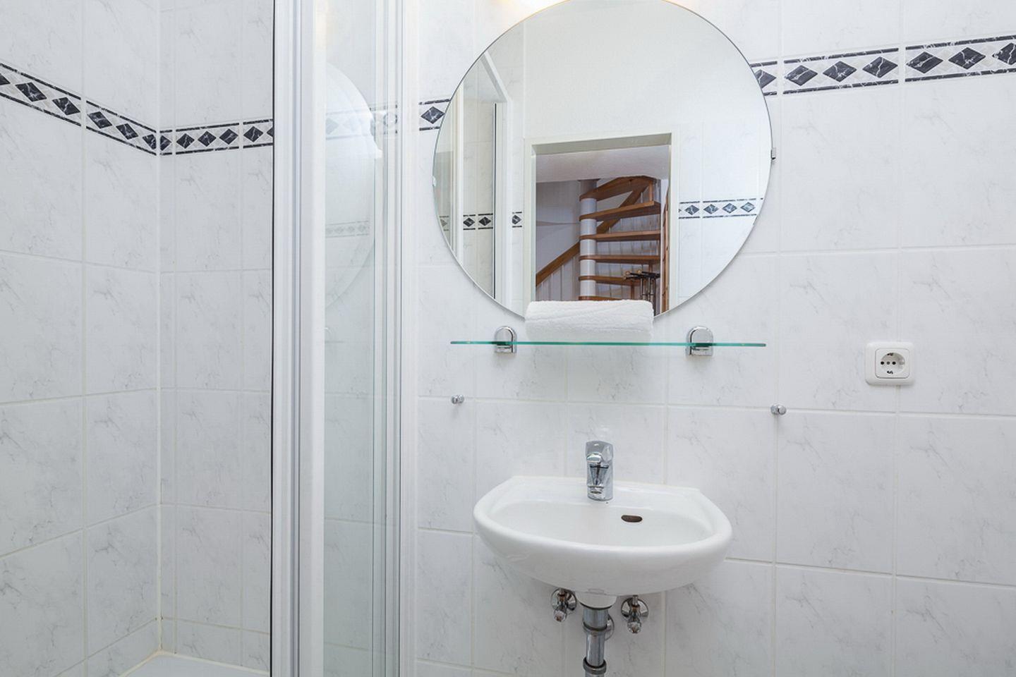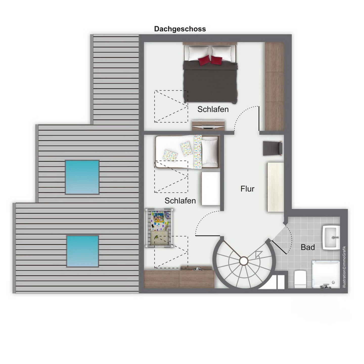 Die obere Ebene erreichst du über eine Wendeltreppe. Hier befinden sich zwei Schlafzimmer, die mit Teppichboden ausgelegt sind. Im ersten Schlafzimmer verspricht ein Doppelbett (2 x 90 x 200 cm) erholsamen Schlaf. Ein großzügiger Kleiderschrank bietet viel Platz für deine Urlaubsgarderobe. Ein zweiter Flachbildfernseher ist hier ebenfalls vorhanden. Das zweite Schlafzimmer verfügt über ein Bett (140 x 200 cm) und zusätzlich über ein Kinderreisebett und einen Schrank mit integriertem Schreibtisch. Auch hier findest du einen Flachbildfernseher. Zur Unterhaltung stehen dir diverse CDs, DVDs, Gesellschaftsspiele und einige Spiele für die Kleinsten zur Verfügung. Zwei geflieste Duschbäder, eins im oberen und eins im unteren Bereich, können von dir genutzt werden.