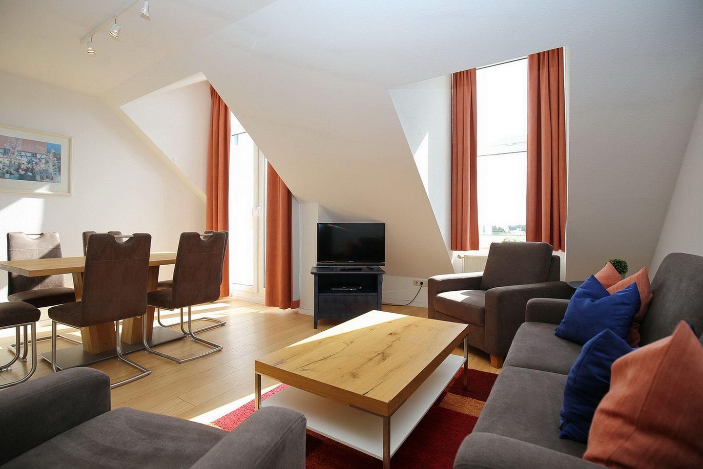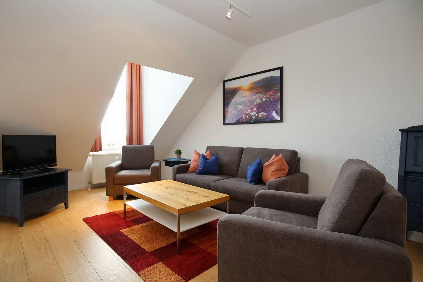 Vom Wohnbereich aus gelangst du direkt auf den möblierten Balkon. Im Wohnzimmer befindet sich eine gemütliche Sitzgruppe. Zur Unterhaltung stehen für dich der Flachbild-TV und Stereoanlage zur Verfügung.