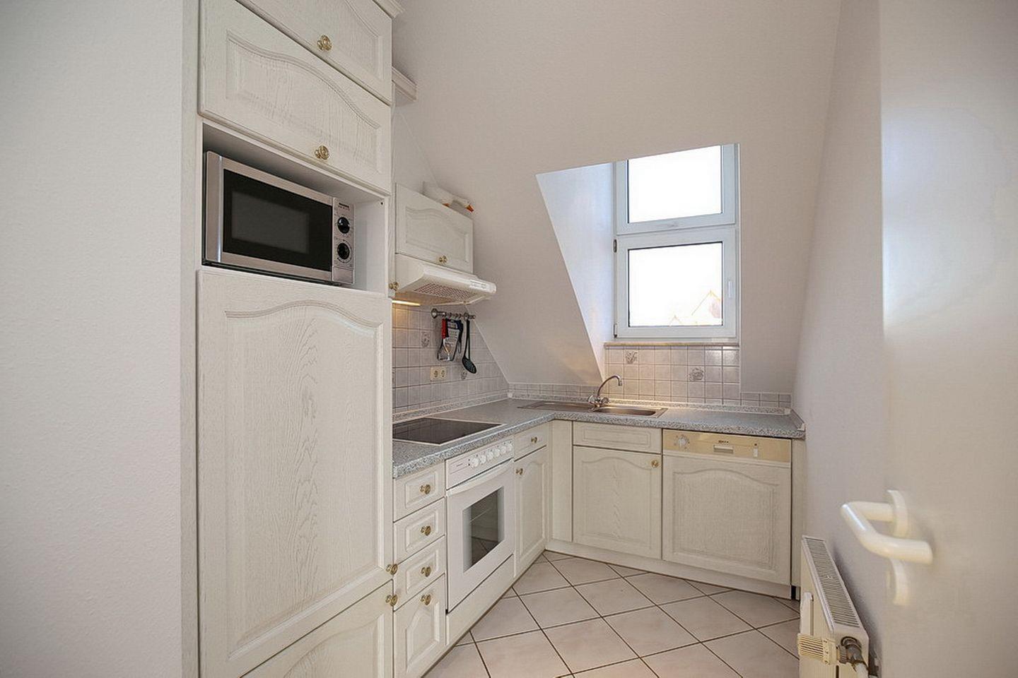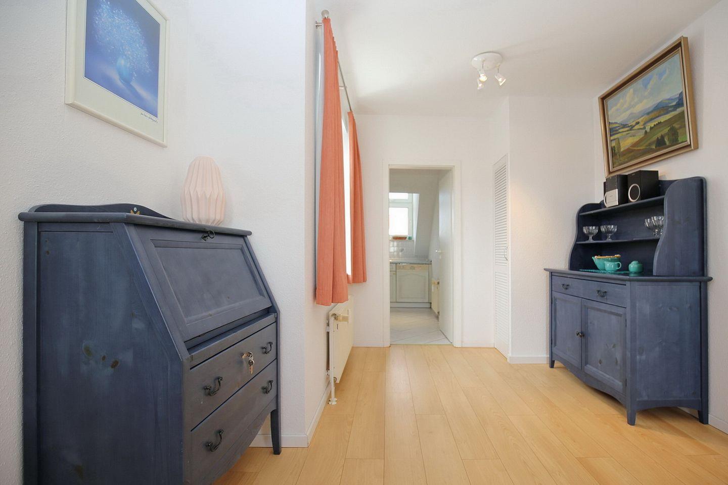 Die Ferienwohnung mit einem Balkon in Süd-Ost-Lage liegt im zweiten Obergeschoss und verläuft über 2 Etagen. Auf ca. 61 m² bietet die 3-Zimmer-Wohnung einen Wohn- und Essbereich, zwei Schlafzimmer, eine Küchenzeile und ein Duschbad. Zum Strand sind es von der Ferienanlage Sünnslag nur etwa 400 m.
