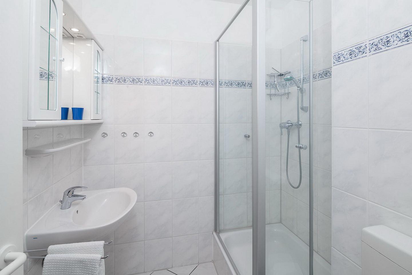 In der modernen, separaten Küche befinden sich ein Kühlschrank mit Tiefkühlfach, Backofen, Cerankochfeld, Geschirrspüler sowie Kaffeemaschine, Toaster und Wasserkocher. Das Bad ist modern eingerichtet und mit einer Dusche ausgestattet. Im Wohnbereich, Küche und Bad sind Fliesen verlegt. Ein Schlafzimmer ist mit Teppichboden ausgelegt, in dem anderen wurde Laminat verwendet. Zur Verdunkelung dienen in dieser Ferienwohnung Vorhänge. Hier handelt es sich um eine Nichtraucherwohnung, in der Haustiere nicht erwünscht sind.