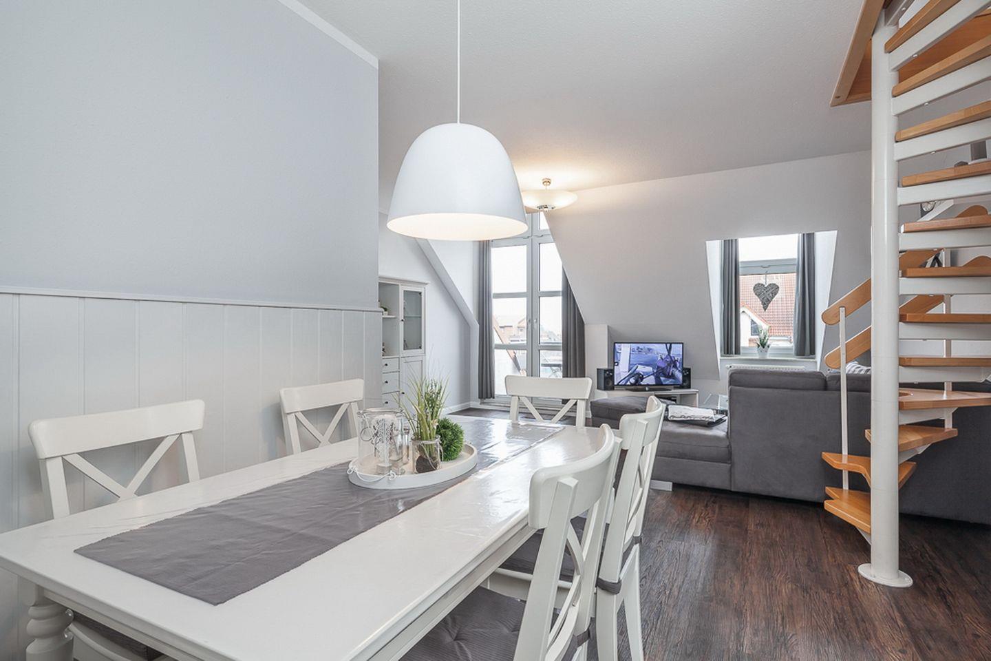 In der 4-Zimmer-Wohnung mit ca. 75 m² Wohnfläche und einem Balkon in Süd-Ost Lage finden maximal 6 Personen ein Urlaubsdomizil in modernem Design. Die Wohnung liegt im 2. OG und verläuft über zwei Etagen. Es steht ein Wohn- und Essbereich, drei Schlafzimmer, eine Küche und ein Duschbad zur Verfügung. Die Entfernung zum Strand beträgt von der Anlage Sünnslag ca. 400 m.