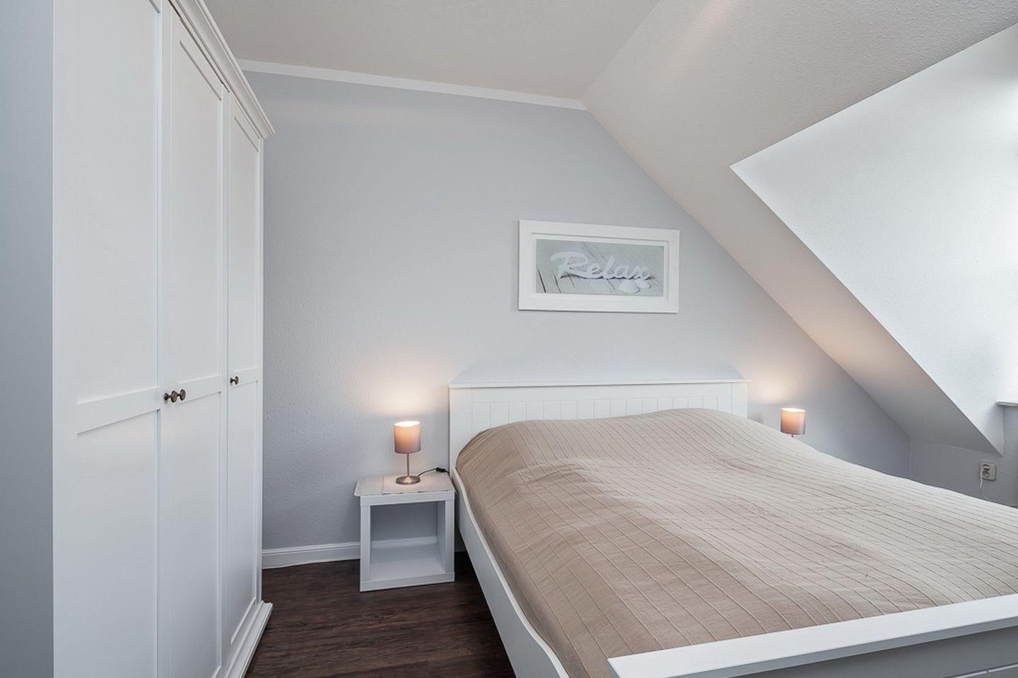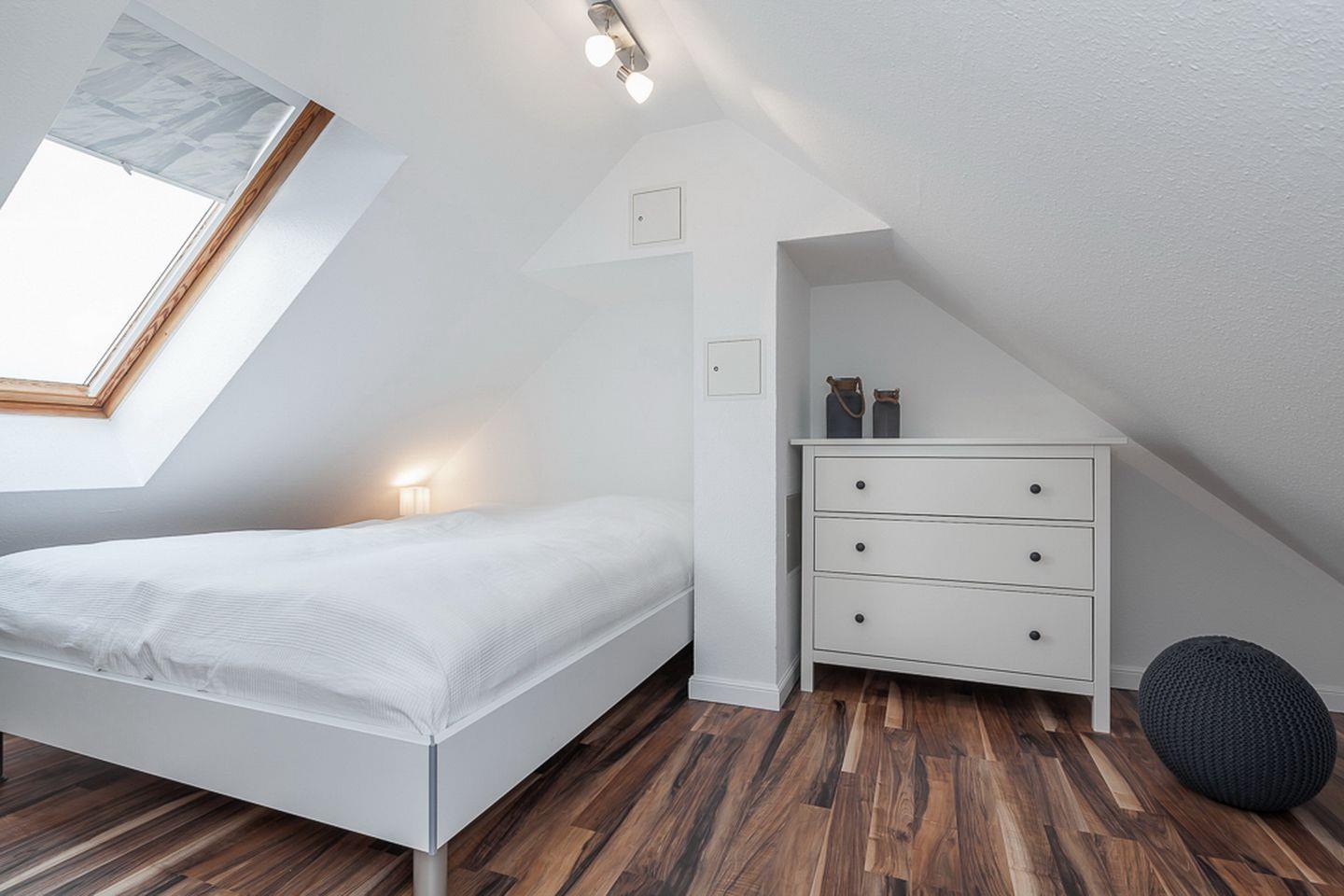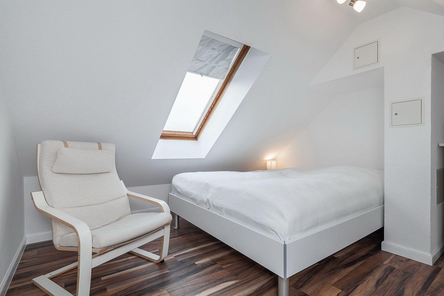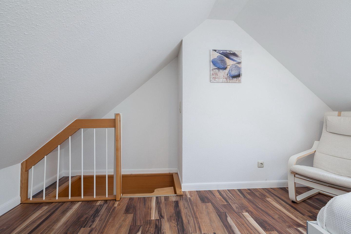 Die beiden unteren Schlafzimmer sind mit jeweils einem Doppelbett (2 x 90 x 200 cm) und einem Kleiderschrank für deine Urlaubsgarderobe möbliert. Der offene Schlafbereich im Dachgeschoss ist über die Treppe im Wohnzimmer zu erreichen. Hier befindet sich ein Doppelbett (2 x 90 x 200 cm) und eine Kommode. An allen Fenstern ermöglichen Verdunkelungsrollos einen erholsamen Schlaf. In der gesamten Wohnung ist hochwertiger Design-Belag verlegt.