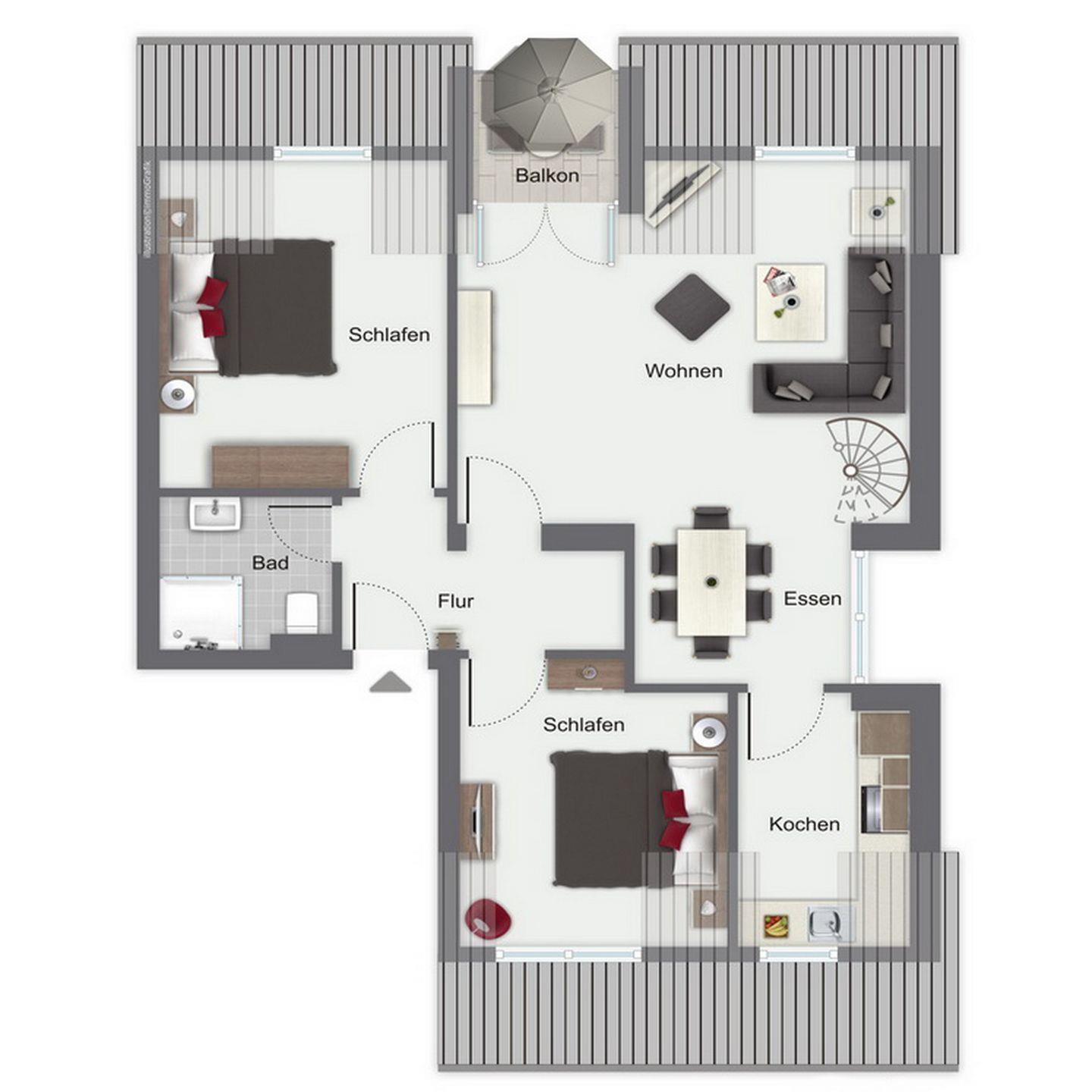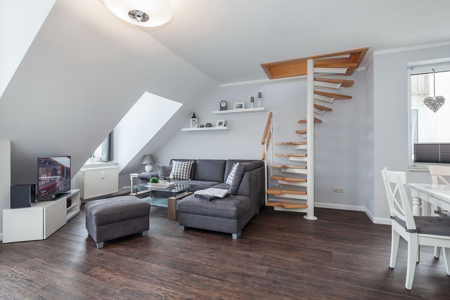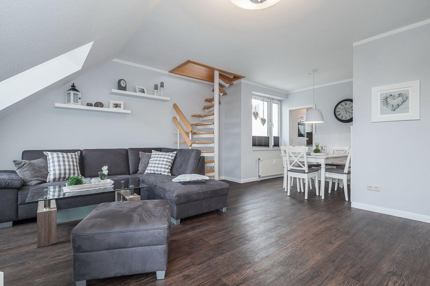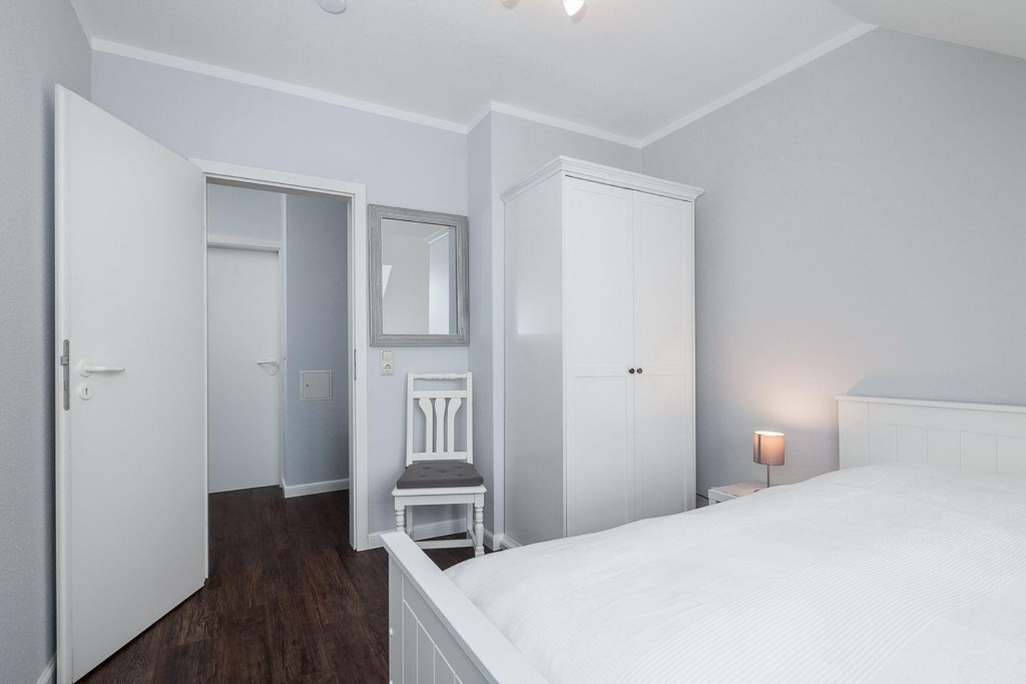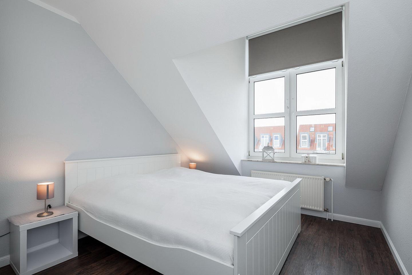 Die beiden unteren Schlafzimmer sind mit jeweils einem Doppelbett (2 x 90 x 200 cm) und einem Kleiderschrank für deine Urlaubsgarderobe möbliert. Der offene Schlafbereich im Dachgeschoss ist über die Treppe im Wohnzimmer zu erreichen. Hier befindet sich ein Doppelbett (2 x 90 x 200 cm) und eine Kommode. An allen Fenstern ermöglichen Verdunkelungsrollos einen erholsamen Schlaf. In der gesamten Wohnung ist hochwertiger Design-Belag verlegt.