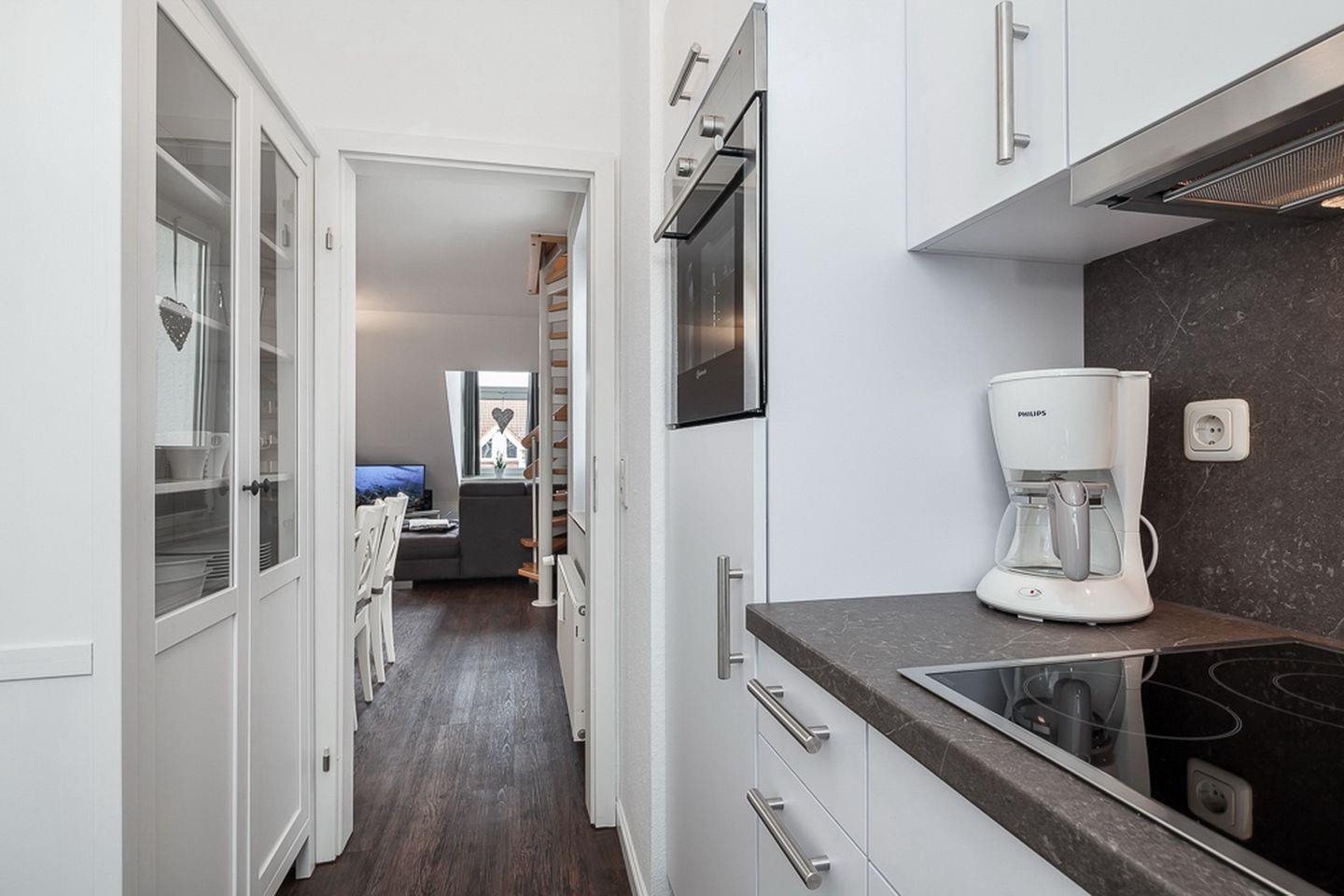 Die Küche liegt separat. Zur Ausstattung gehören neben ausreichend Geschirr, ein Cerankochfeld, ein Backofen in komfortabler Höhe, ein Kühlschrank mit Gefrierfach und ein Geschirrspüler.