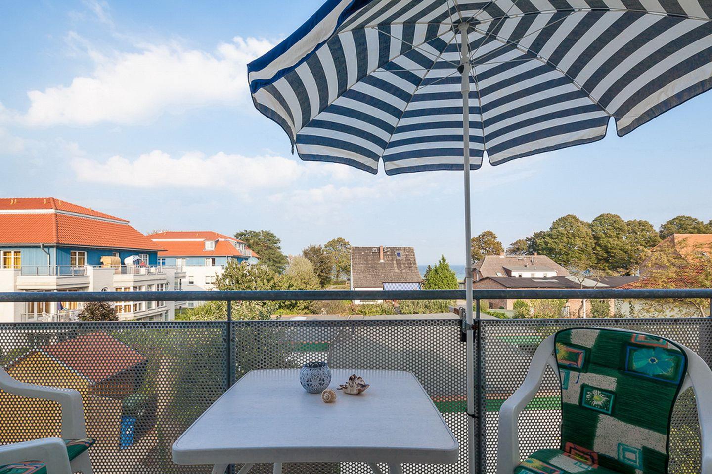 Komfortable 3-Zimmer-Ferienwohnung mit Balkon und Seeblick, nur 100 m vom Strand in Boltenhagen entfernt.