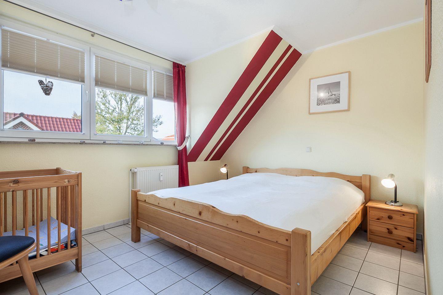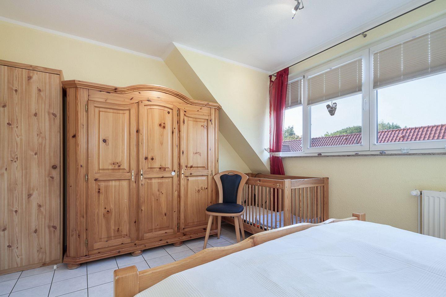 Das erste Schlafzimmer ist mit einem Doppelbett (2 x 90 x 200 cm), einem stabilen Kinderbett und einem 3-türigen-Kleiderschrank möbliert. Das zweite Schlafzimmer ist mit einem Doppelbett (2x 80 x 200 cm) eingerichtet. Zur Verdunklung an den Fenstern dienen in den Schlafzimmern Rollos.
