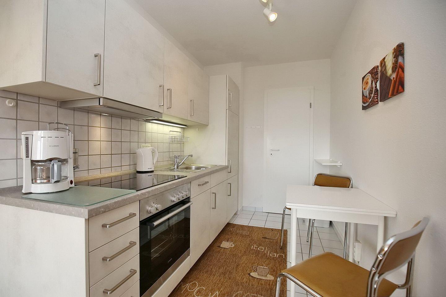 Das Duschbad bietet ebenfalls Ablagemöglichkeiten für deine Utensilien. Der Bodenbelag ist im Wohn- und Schlafzimmer Teppich. Der Küchenbereich wurde gefliest. In dieser Nichtraucherwohnung sind Haustiere nicht erlaubt.