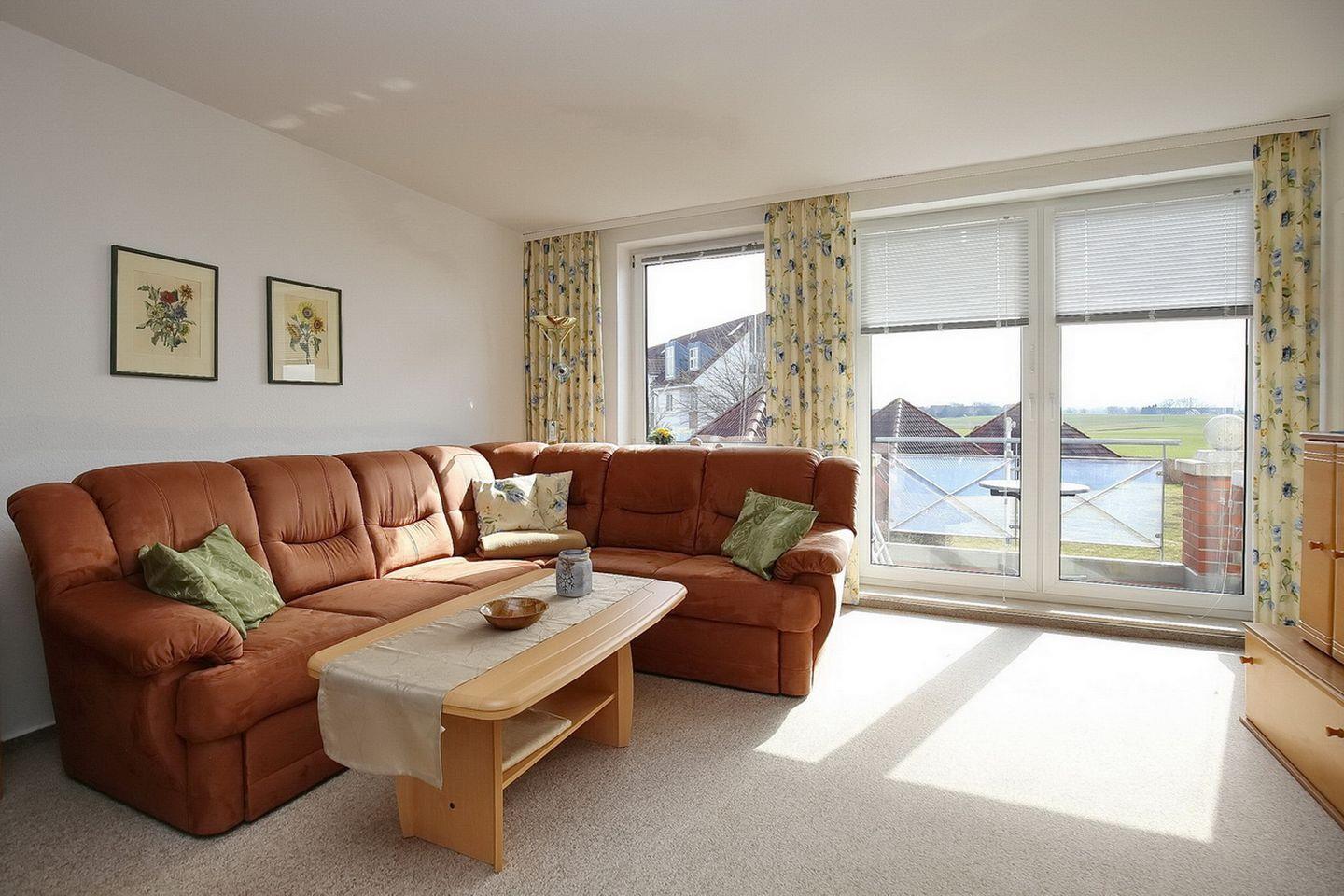 Der Balkon ist möbliert und lädt mit seinem schönen Ausblick ins Grüne zum Sonnenbaden ein. Der Wohnbereich hat eine große Eckcouch und sorgt mit den bodengleichen Fenstern für viel Licht. Für deine Unterhaltung gibt es in der Ferienwohnung einen Flachbild-TV und ein Radio.