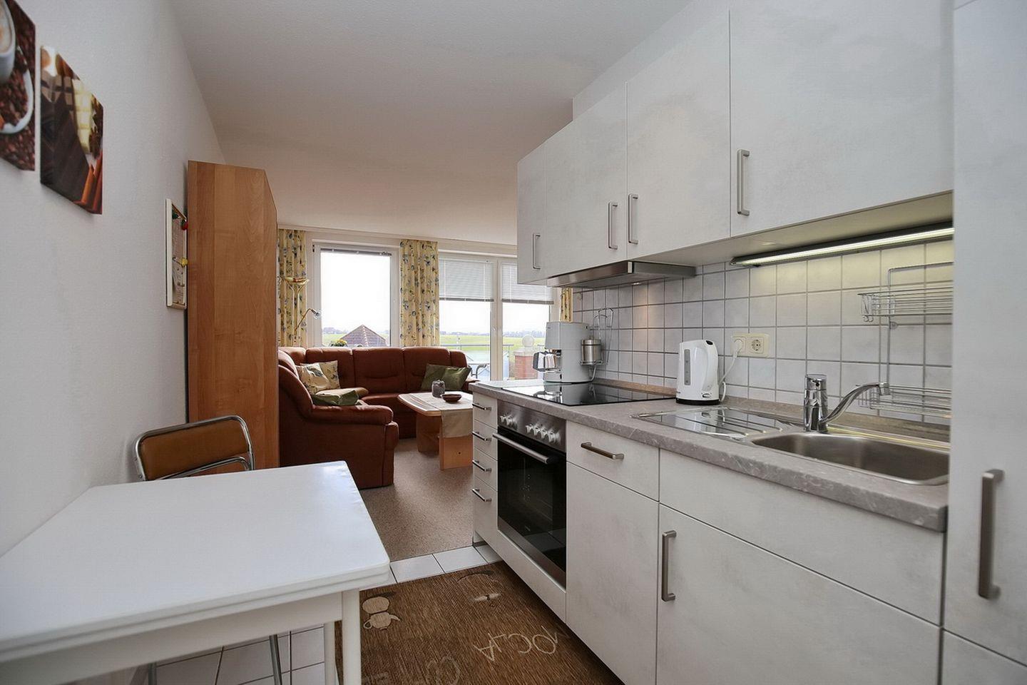 Die Küchenzeile verfügt über 4-Plattenkochfeld mit Backofen, Mikrowelle, Geschirrspüler und Kühlschrank mit Gefrierfach. Ein gemütlicher Essplatz befindet sich in unmittelbarer Nähe der Küchenzeile.