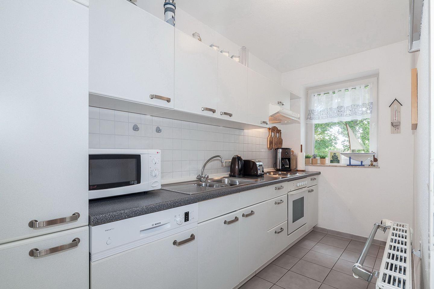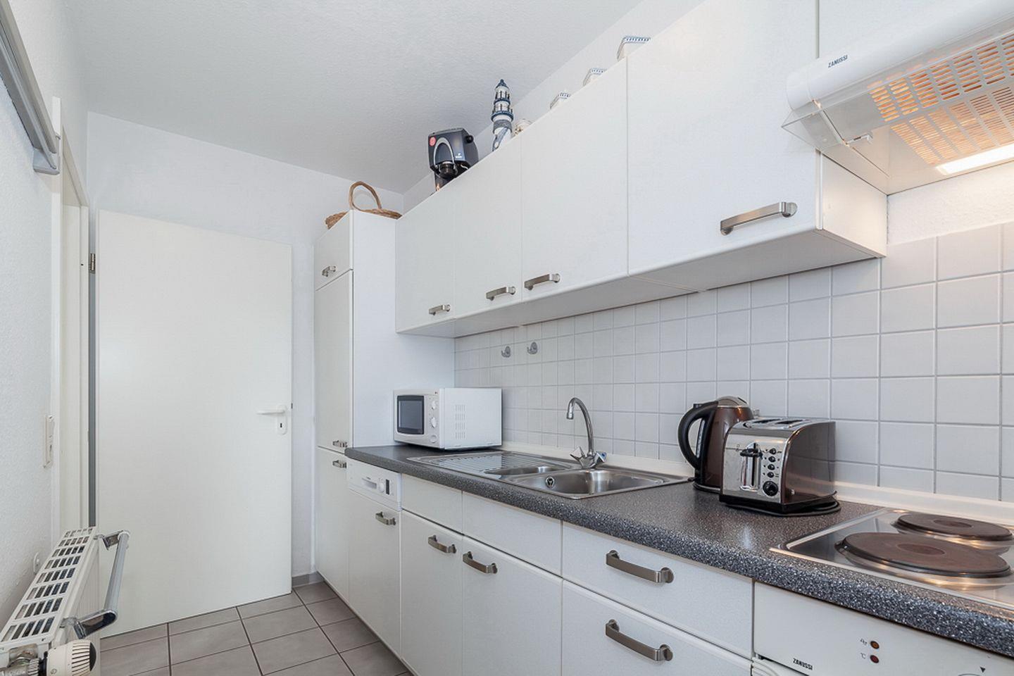 In der separaten Küche findest du einen 4-Platten-Herd mit Backofen, einen Geschirrspüler, Kühlschrank mit Gefrierschrank, eine Mikrowelle und vieles mehr vor. Im Duschbad steht dir eine Waschmaschine zur Verfügung. Die separate Küche und das Duschbad sind gefliest. In dieser Nichtraucherwohnung sind Haustiere nicht erlaubt.