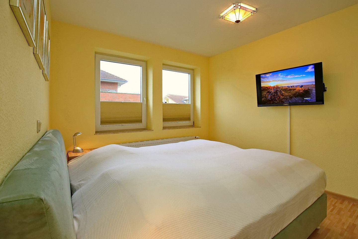 Im Schlafzimmer befindet sich ein bequemes Boxspringbett (2 x 90 x 200 cm) sowie ein zweiter Fernseher. In dem geräumigen 3-türigen Kleiderschrank findet deine Urlaubsgarderobe viel Platz.