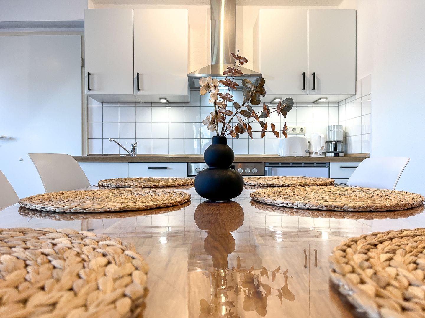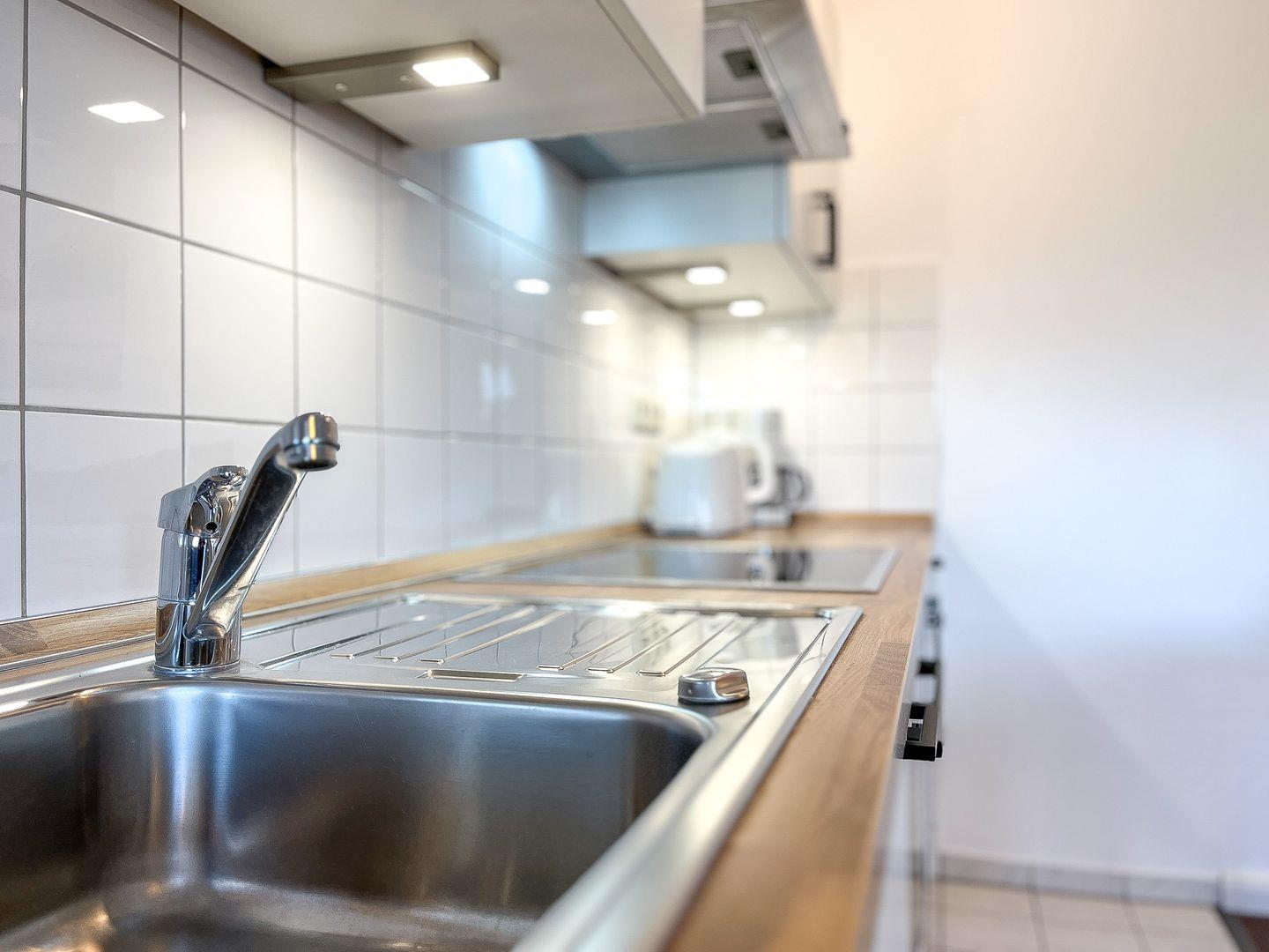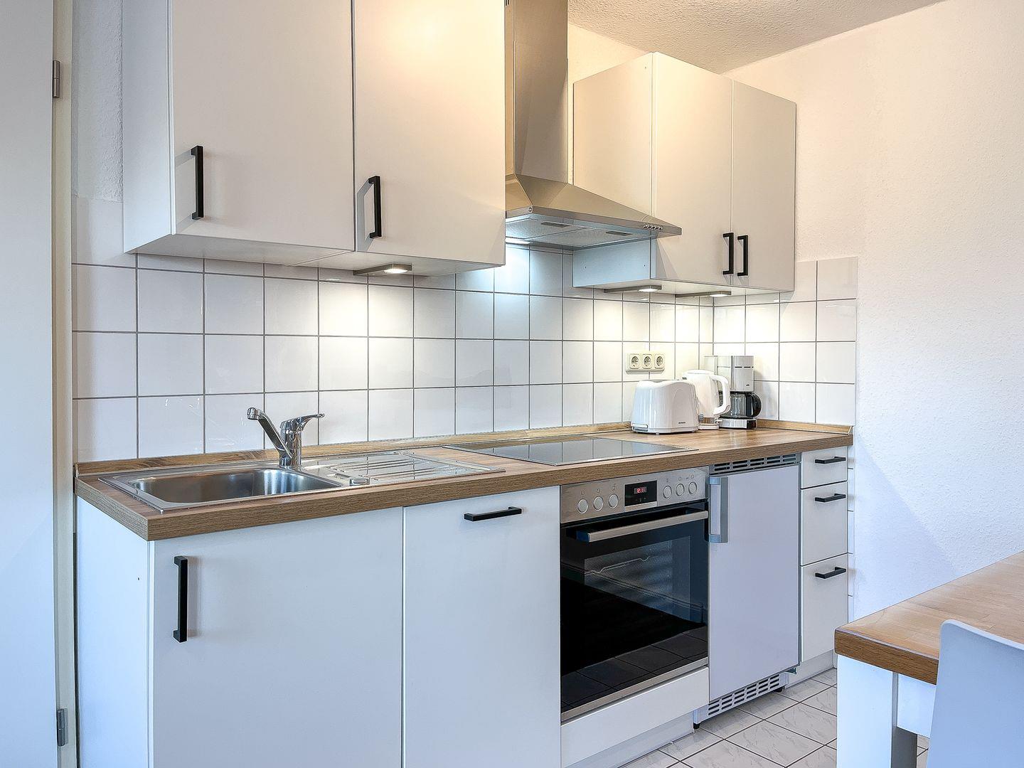 Die Küchenzeile verfügt unter anderem über einen 4-Platten-Herd mit Ceranfeld und Backofen, Mikrowelle, Kühlschrank mit Gefrierfach und Geschirrspüler.