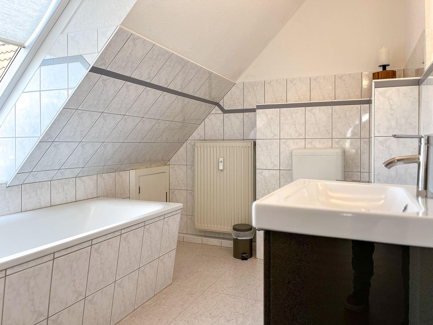 Im oberen Bereich befinden sich ein Bad mit Wanne, Waschtisch und WC – auch hier wurde ein Kindertoilettensitz berücksichtigt.