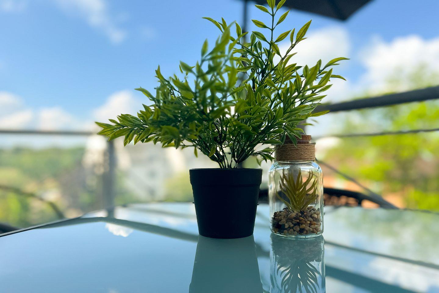 Im behaglich eingerichteten Wohnzimmer, das mit Vinyl ausgelegt ist, stehen dir ein Flat-Screen-TV und eine Stereoanlage zur Verfügung. Das Boxspringsofa (Liegefläche ca. 160 x 200 cm) kann bei Bedarf in einen komfortablen Schlafplatz für 2 Personen verwandelt werden. Vorhänge dienen als Sicht- und Sonnenschutz. Ansonsten sind die Fenster mit Plissees ausgestattet. Der großzügige Balkon ist mit Balkonmöbeln ausgestattet und lädt zum Verweilen ein.
