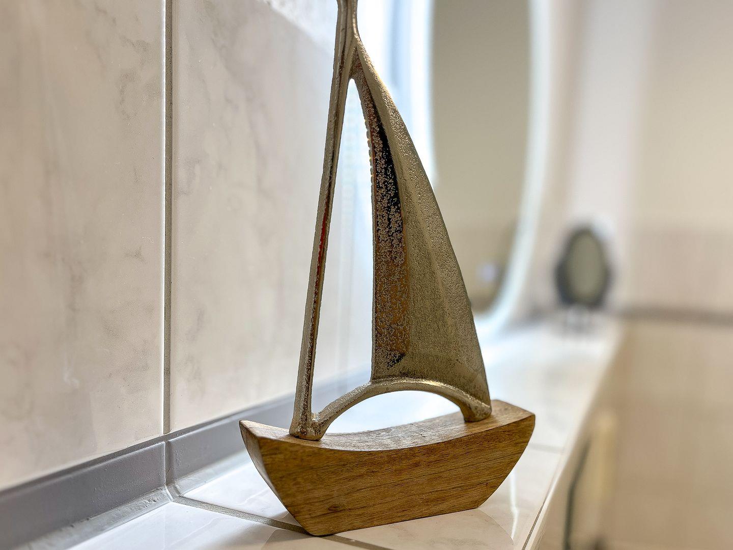 Im unteren Bereich steht dir ein gefliestes Bad mit Dusche, Waschtisch und WC zur Verfügung. Für den Nachwuchs wurde ein Kindertoilettensitz integriert. Ein Handtuchheizkörper sorgt für wohlige Wärme.