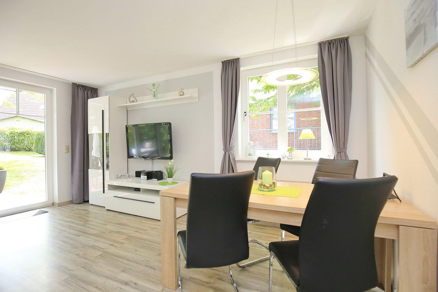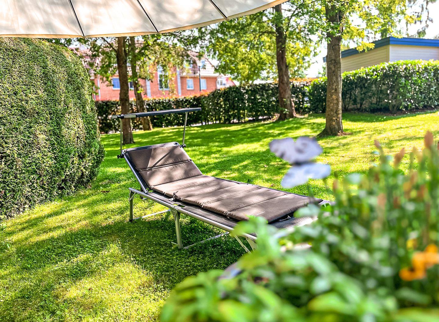 Aus deinem Wohnzimmer betrittst du die sonnig gelegene Terrasse, auf der du schöne Stunden im Freien verbringen kannst, hierfür steht dir eine Sonnenliege zur Verfügung. Von hier aus hast du direkten Zugang zur anschließenden Rasenfläche. Das Wohnzimmer ist mit einem Schlafsofa (160 x 200 cm), einer Kommode sowie einem Esstisch für 4 Personen eingerichtet. Zur Unterhaltung werden dir ein TV, eine Stereoanlage, Spiele und Bücher angeboten.