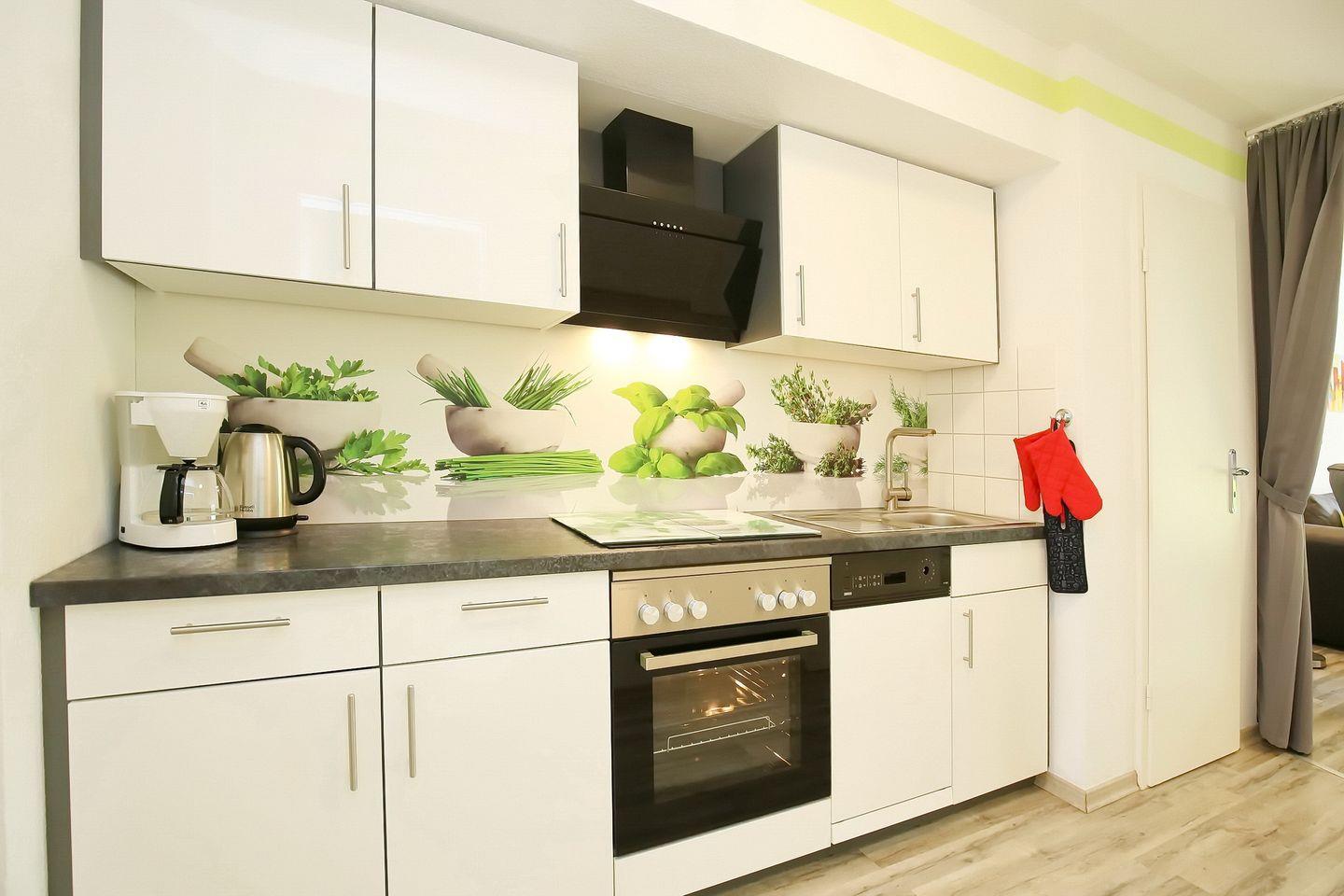 In der integrierten Küchenzeile sind ein 4-Platten-Ceranfeld mit Backofen, ein Geschirrspüler, ein Kühlschrank und ein Gefrierschrank sowie eine Mikrowelle vorhanden. Als Bodenbelag dient in der gesamten Wohnung Laminat.