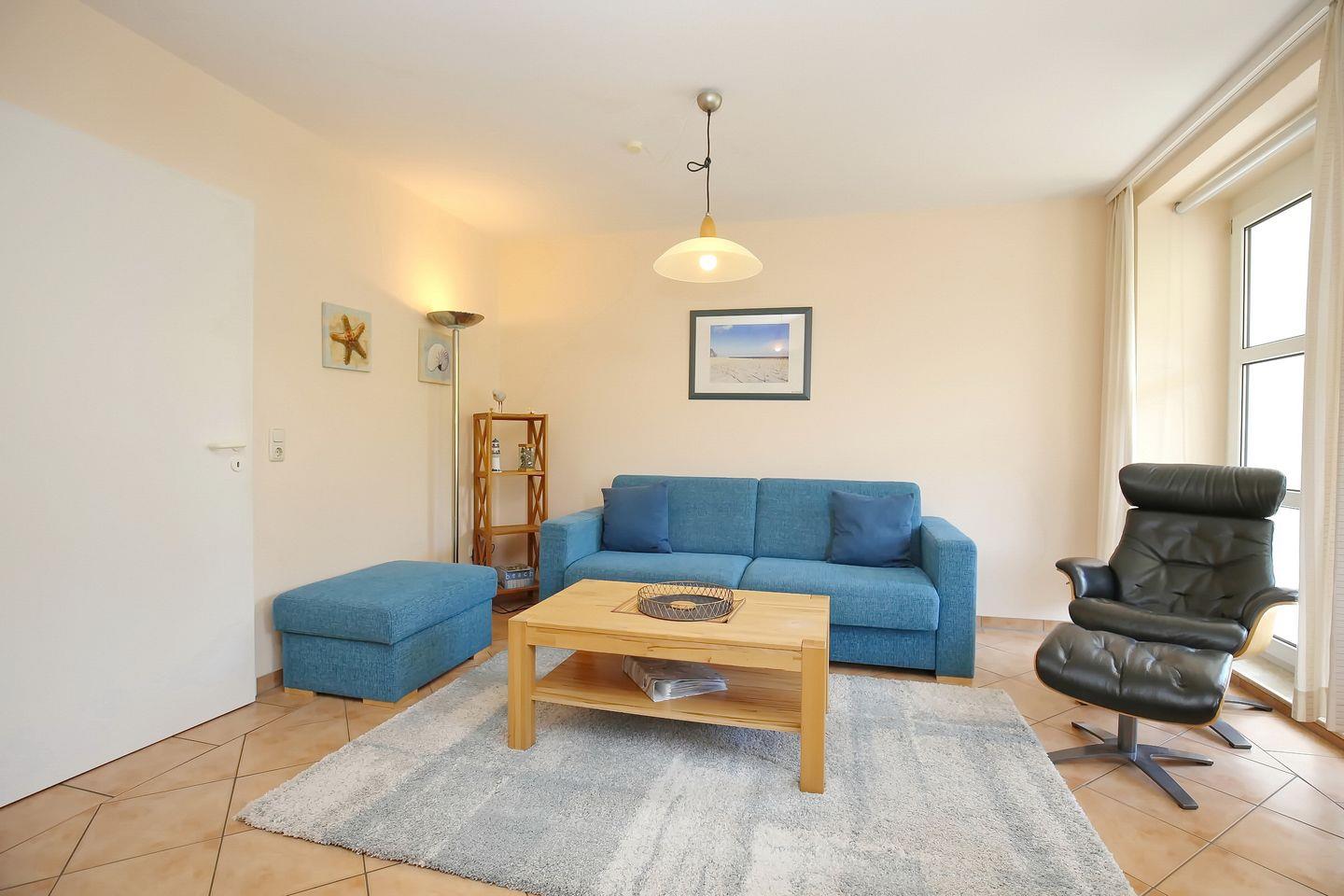 Den möblierten Balkon in Süd-Ost-Lage erreichst du aus dem Wohnzimmer. Der Wohnbereich ist mit einem modernen ausziehbarem Schlafsofa (170 x 200 cm), einem Jumbohocker, einem Designer-Lederrelaxsessel mit Liegefunktion und dazugehörigem Hocker sowie einem Echtholzcouchtisch und einem Essbereich für die gemeinsamen Mahlzeiten ausgestattet. Der Boden ist gefliest. Der moderne Flachbild-TV, die Stereoanlage mit Dockingstation sowie eine gut sortierte Auswahl an Büchern lassen keine Langeweile aufkommen.