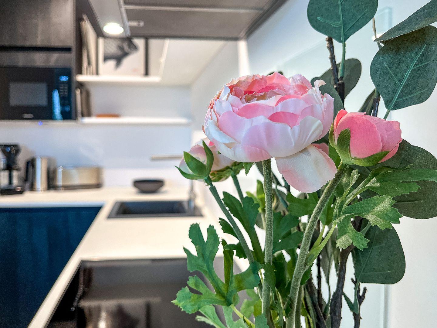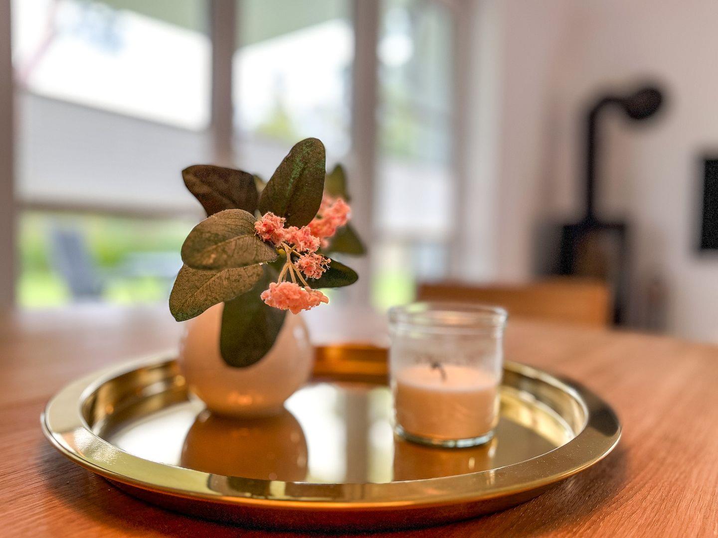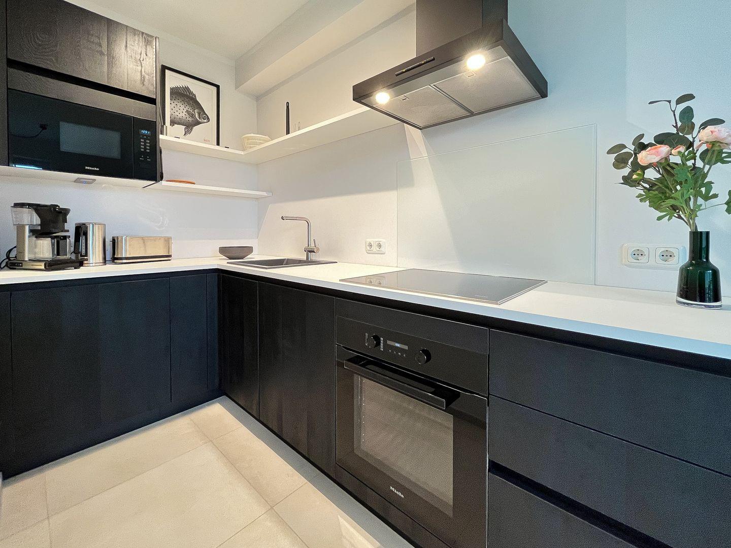 Die hochwertige Küchenzeile der Ferienwohnung ist vom Wohnzimmer etwas abgeteilt und verfügt über Geschirrspüler, Herd mit Backofen und einem 4-Platten-Cerankochfeld, extrabreiten Dunstabzug, Kühlschrank mit Tiefkühlfach, Mikrowelle und vieles mehr.