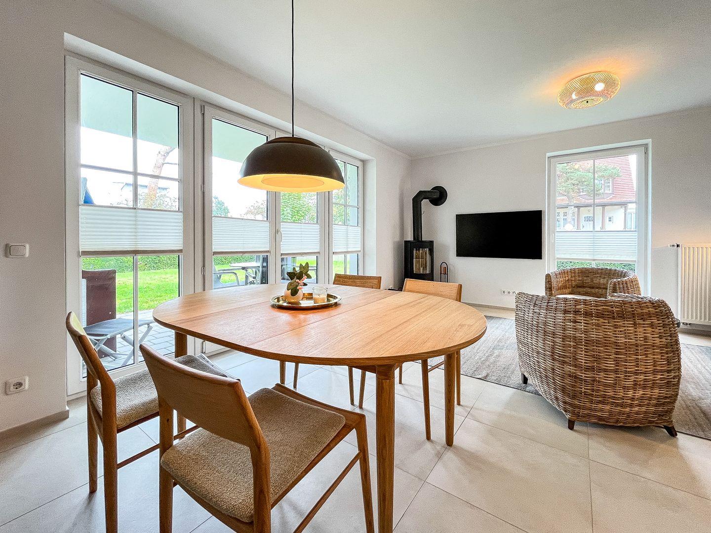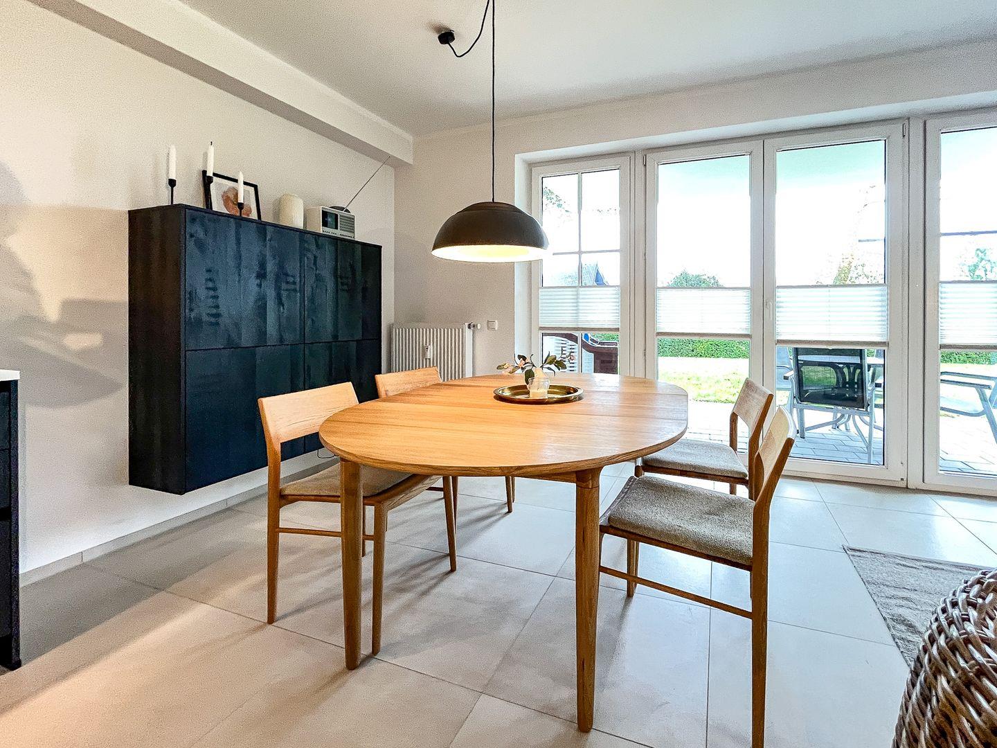 Im Wohnzimmer befindet sich eine Couch, ein Kamin, ein großer schwenkbarer LCD-Fernseher mit PC-Anschluss sowie ein DVD-Player. An dem modernen, gemütlichen Essbereich finden 4 Personen Platz. Vom Wohnzimmer aus gelangst du auf die, mit Terrassenmöbeln und Strandkorb ausgestattete, Terrasse und in den angrenzenden Garten. Hier kannst du deinen Kaffee genießen und die Kinder in Sichtweite spielen. (Teilseeblick!)