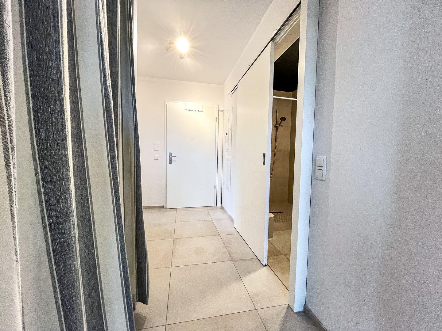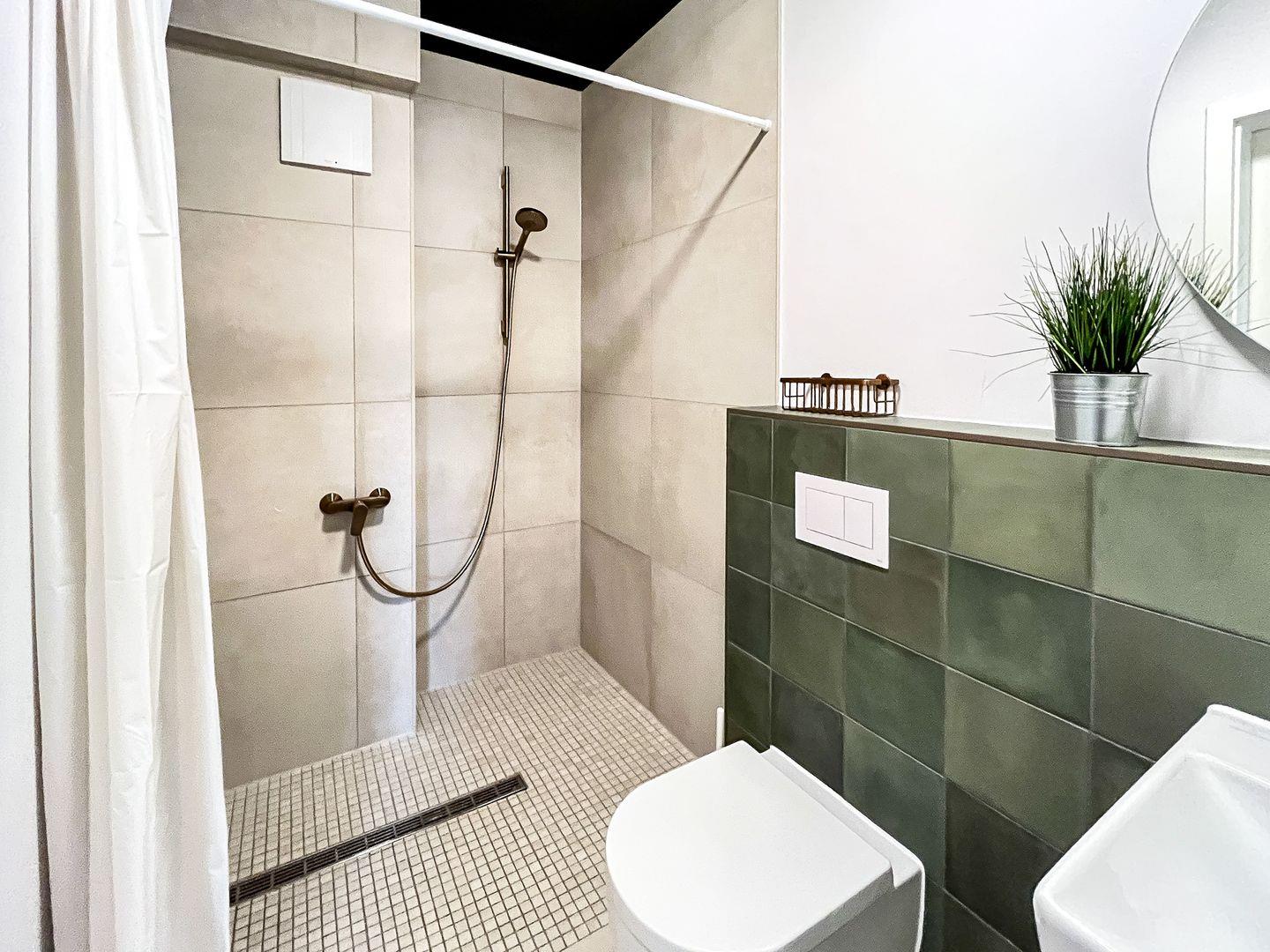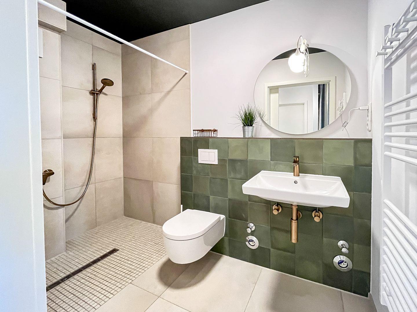 Das moderne Duschbad dieser Ferienwohnung ist mit einer Fußbodenheizung ausgestattet und bietet angenehmen Duschkomfort. Ein durchgehender Fliesenboden befindet sich in allen Räumen, an den Fenstern sind Jalousien und Vorhänge.