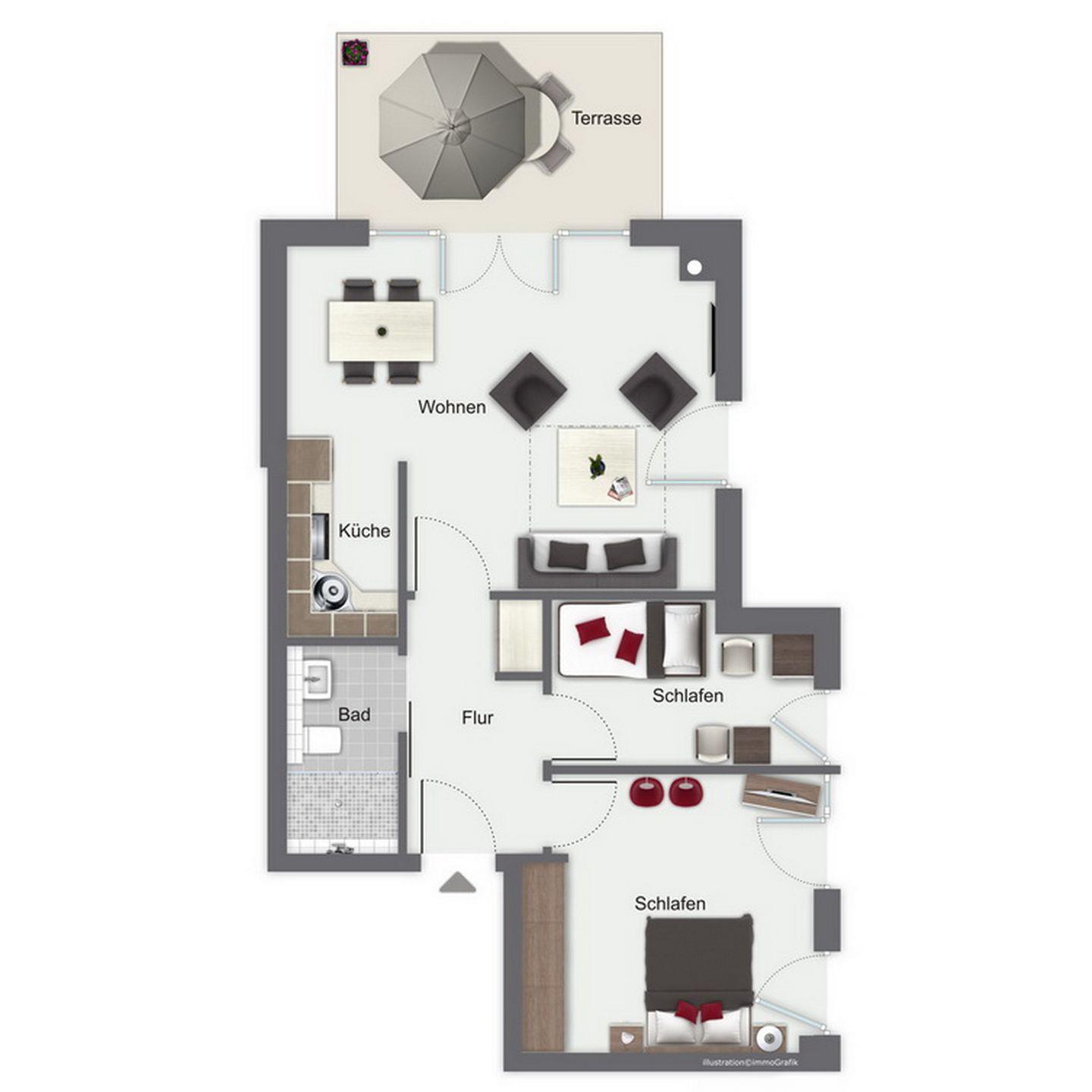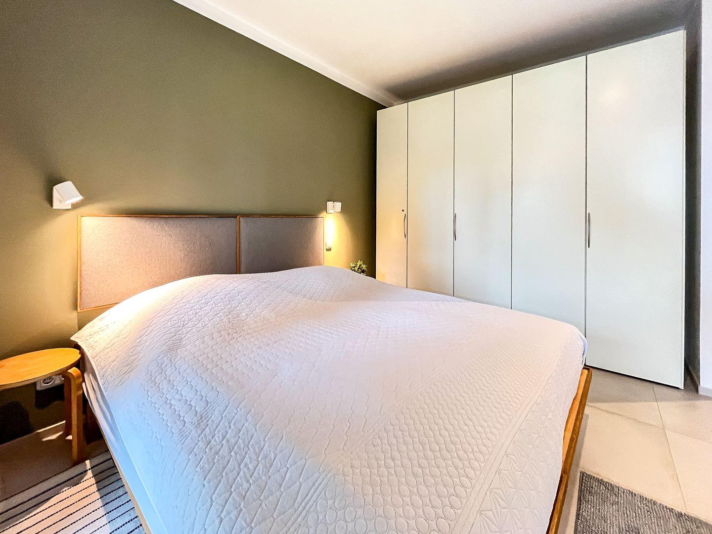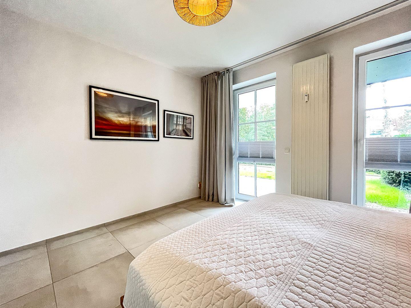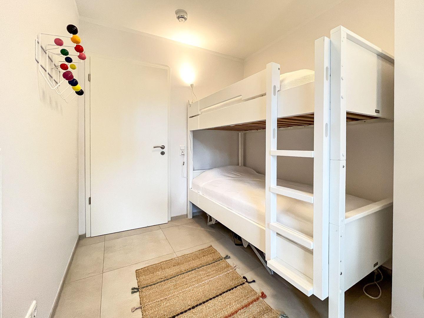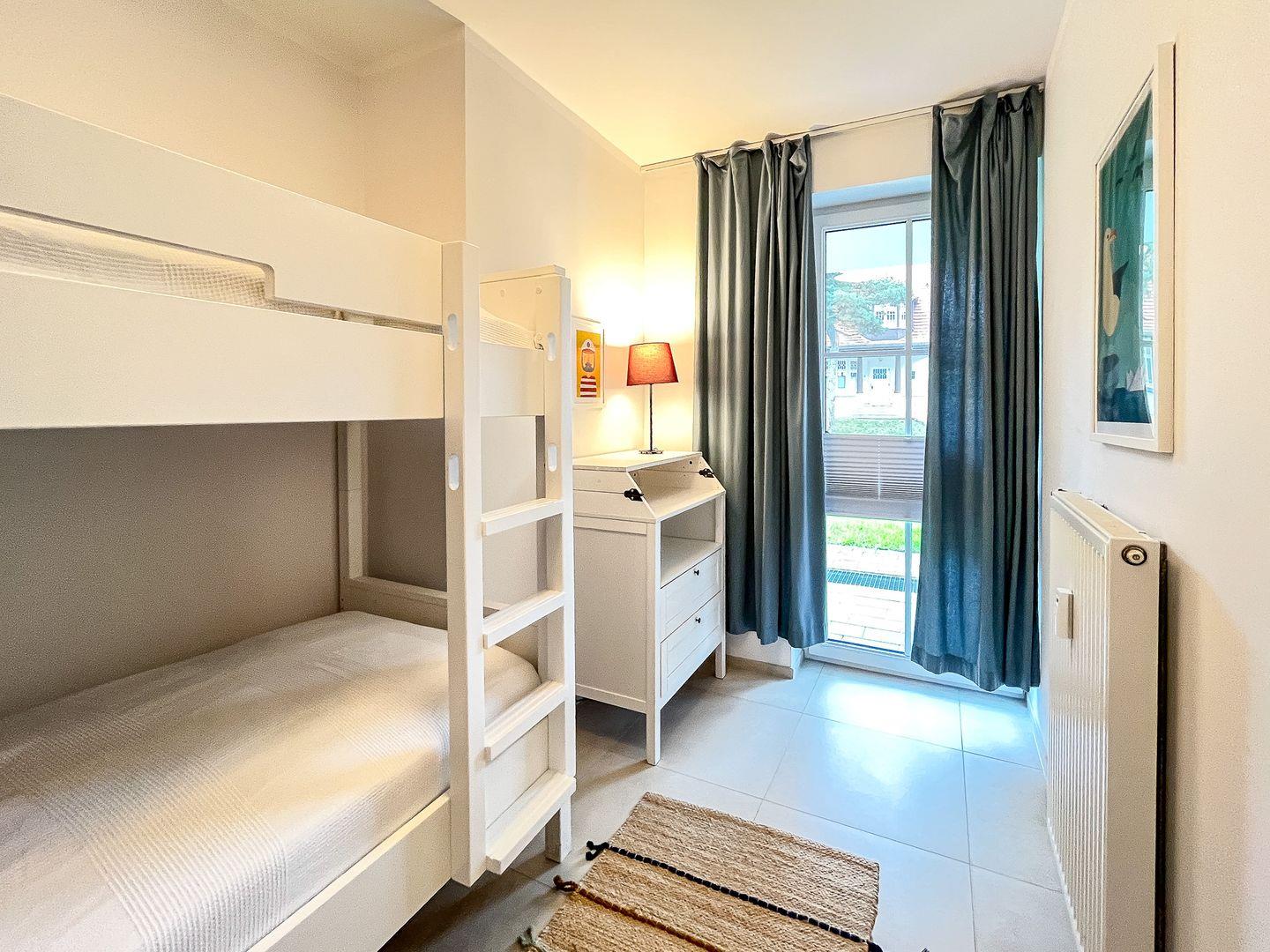 Im großen Schlafzimmer befindet sich ein Doppelbett (2 x 90 x 200 cm) und im kleinen Schlafzimmer ist ein Etagenbett (90 x 200 cm) vorhanden. Von beiden Schlafzimmern aus kannst du eine zweite Terrasse betreten. Auch hier kannst du den Teilseeblick genießen. Beide Schlafzimmer haben Verdunklungsplissees.