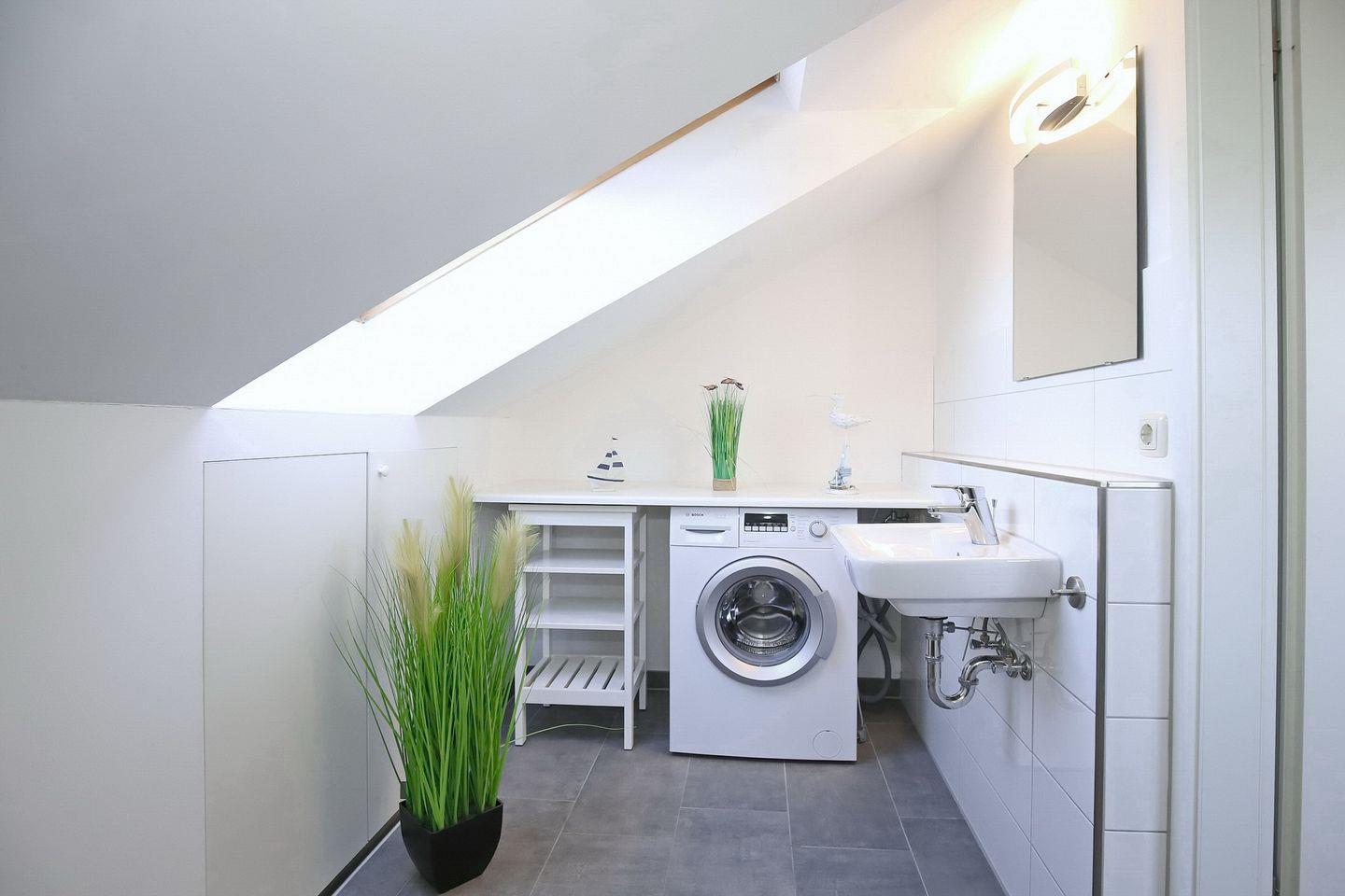 Das Tageslichtbad im Erdgeschoss ist mit einer Dusche, einem Waschbecken sowie einem WC eingerichtet. Ebenfalls im Obergeschoss befindet sich das Gäste-WC mit Waschmaschine. Für die Kleinsten stehen im Ferienhaus ein Hochstuhl, eine Wickelauflage und ein Kinderreisebett bereit.