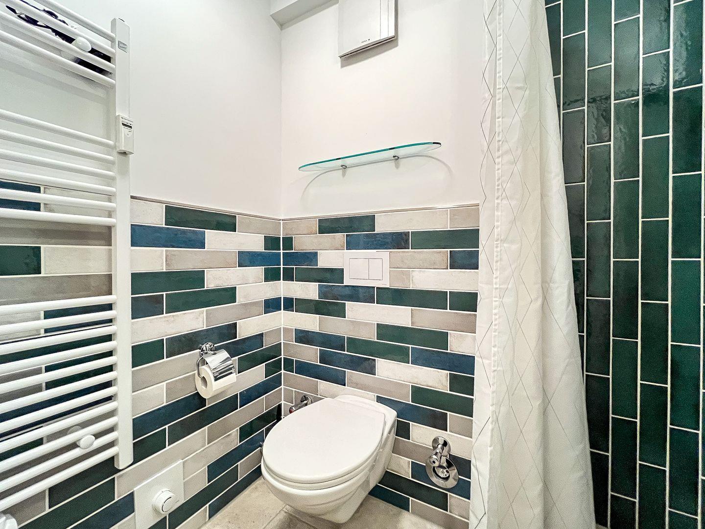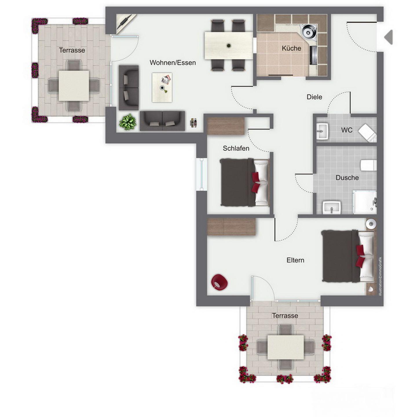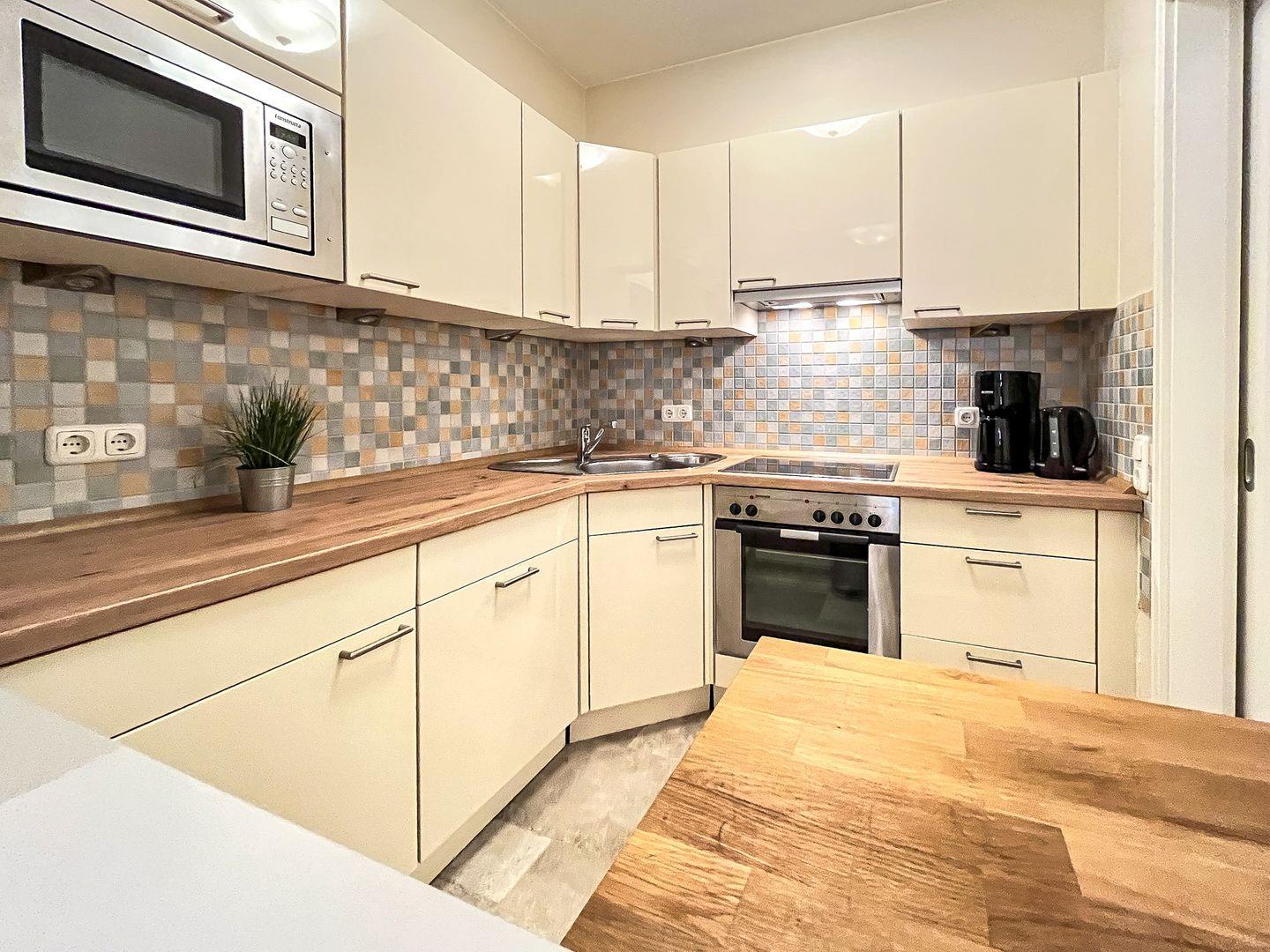 Die hochwertig und modern eingerichtete Küche dieser Ferienwohnung verfügt über einen Geschirrspüler, einen Herd mit Backofen und ein 4-Platten-Cerankochfeld, einen Kühlschrank mit Gefrierfach, eine Mikrowelle und vieles mehr. Das Duschbad ist modern ausgestattet. Ein Gäste-WC ist vorhanden. Auf der Terrasse kannst du den vorhandenen Elektrogrill (Tischgrill) ausgiebig nutzen.