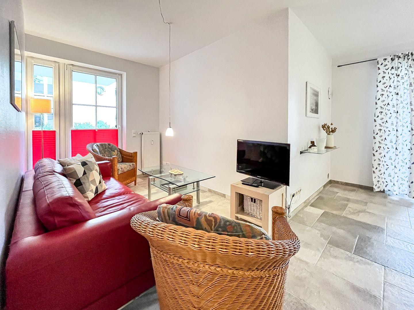 Im modern eingerichteten Wohnzimmer sorgt ein Bullerjan für Gemütlichkeit - somit ist auch ein Urlaub in der kalten Jahreszeit empfehlenswert. Zur Unterhaltung stehen dir ein Flatscreen-TV und eine Stereoanlage zur Verfügung. Der gemütliche Essbereich bietet Platz für kulinarische Genüsse. Vom Wohnzimmer aus gelangst du auf die nord-westlich ausgerichtete Terrasse. Bequeme Terrassenmöbel, eine Liege und ein Strandkorb laden zum Ausspannen ein.