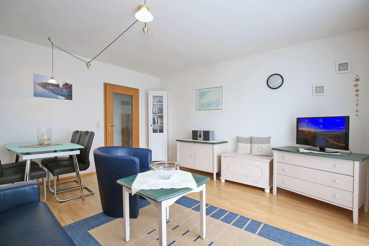 In dieser sonnigen 2-Zimmer-Ferienwohnung wirst du dich wohl fühlen. Im Wohnzimmer steht eine Doppelschlafcouch (160 x 190 cm), die eine Schlafgelegenheit für 2 Personen bietet. Für Unterhaltung bei Regenwetter sorgen der Flachbildfernseher, ein Videorecorder und die HiFi-Anlage. Vom Wohnzimmer gelangst du auf den großen Südbalkon (ca. 8 m²). Von hier aus kannst du den ganzen Tag die Sonne und den Blick ins Grüne genießen.