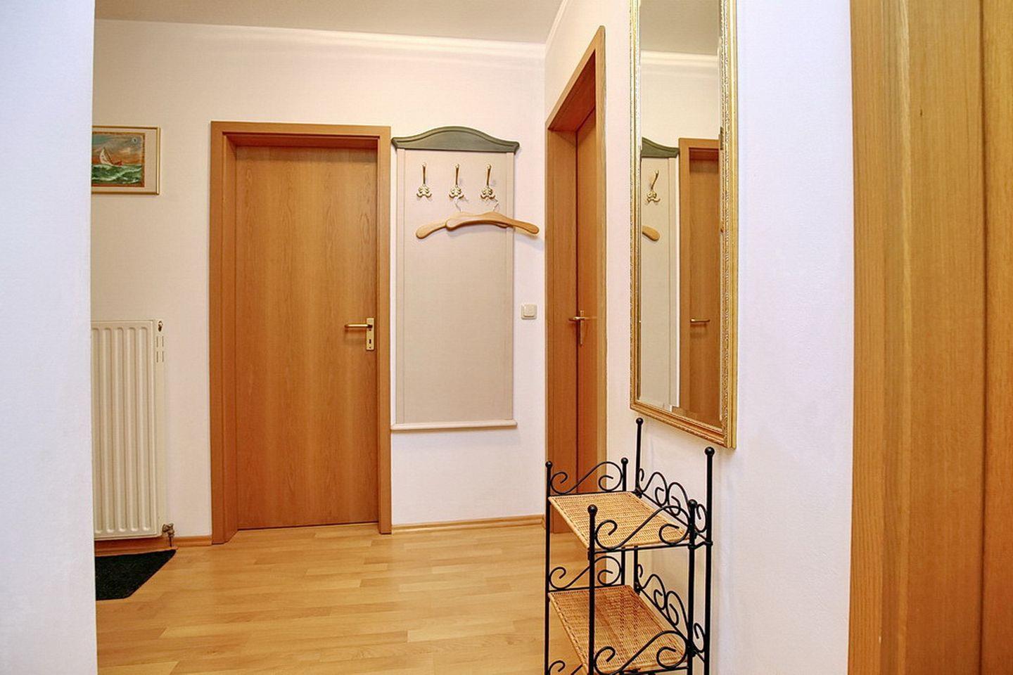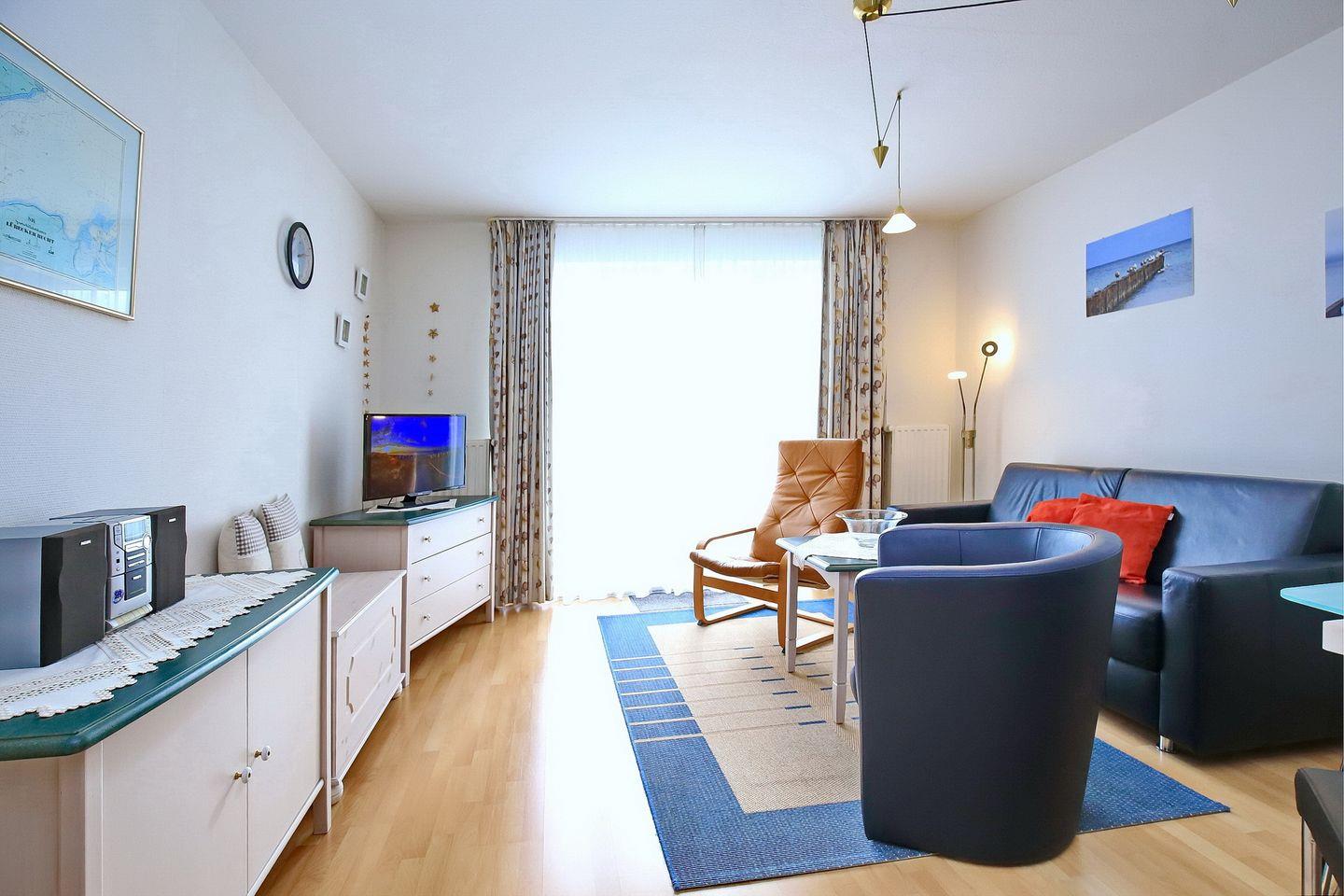 Deine Ferienwohnung befindet sich im 1. OG und bietet auf 55 m² ein Wohnzimmer, ein Schlafzimmer, eine separate Küche, das Duschbad und den Südbalkon. Die Entfernung zum Strand beträgt ca. 100 Meter.