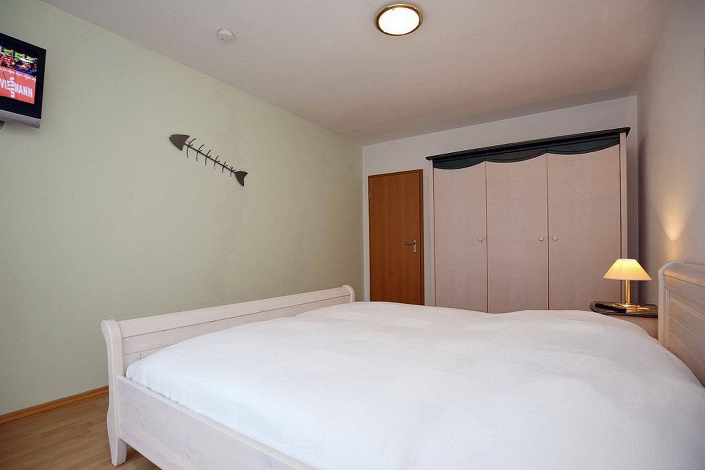 Im Schlafzimmer steht ein großes Doppelbett (2 x 90 x 200 cm) zur Verfügung. Für deine Garderobe ist ein großer Kleiderschrank vorhanden. Auch vom Schlafzimmer aus kannst du den Balkon betreten. Ein Fernseher ist ebenfalls im Schlafzimmer vorhanden.