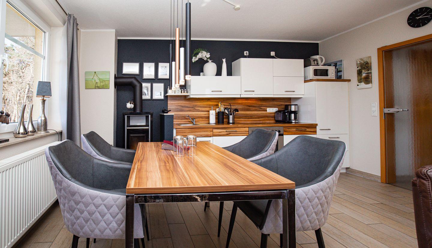 Die Küchenzeile ist komplett ausgestattet mit Geschirrspüler, Mikrowelle, Sandwichmaker, Cerankochfeld (4 Platten) mit Backofen, Kaffeemaschine, Mixer, Kühlschrank mit großem Tiefkühlfach sowie ausreichend Geschirr. An kühlen Ferientagen spendet dir ein Kaminofen wohlige Wärme für Körper und Geist.
