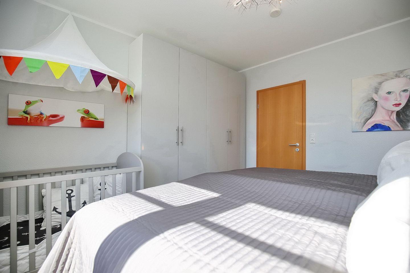In der Ferienwohnung stehen dir zwei Schlafzimmer zur Verfügung. Ein Zimmer mit einem Boxspringbett (180 cm x 200 cm) mit durchgehender Matratze und einem Kindergitterbett und ein Zimmer mit einem Schlafsofa (ausgeklappte Liegefläche 180 cm x 205 cm). Kleine Gäste sind in dieser Ferienwohnung willkommen. In beiden Zimmern schützen dich Fliegengitter vor lästigen Insekten. Ein Hochstuhl kann gern genutzt werden. Als Sicht- bzw. Sonnenschutz dienen Vorhänge.