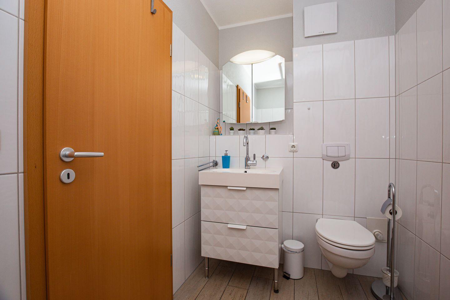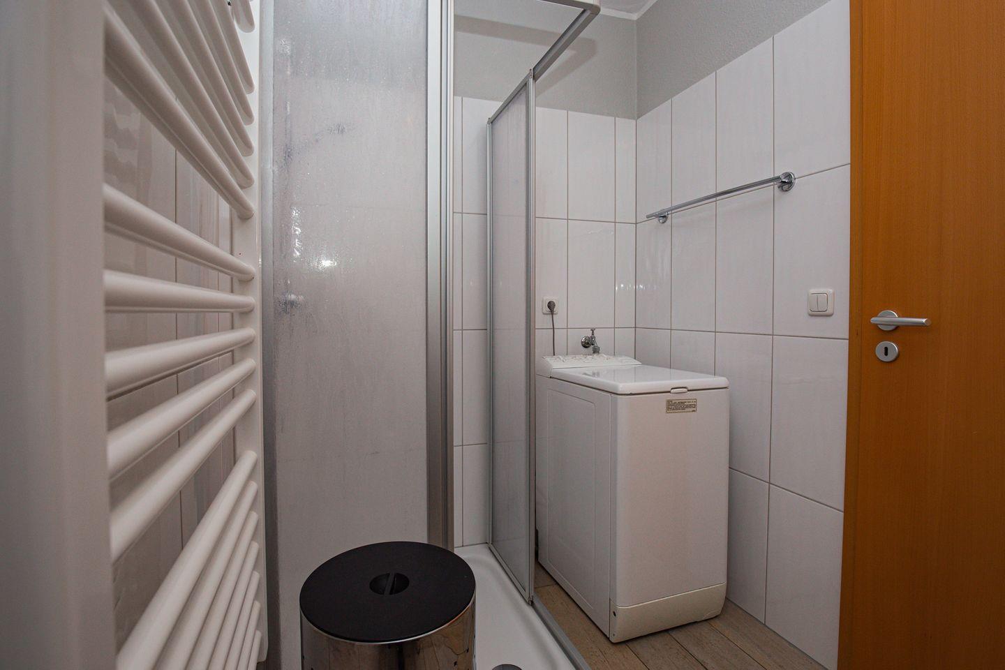 Das Badezimmer ist hell gefliest und mit einer halbrunden Dusche (90 cm x 90 cm), Hänge-WC, Waschbecken, Handtuchheizung und einem Waschtrockner komfortabel ausgestattet. Die Fußbodenheizung im Duschbad sorgt für eine angenehme Wärme.