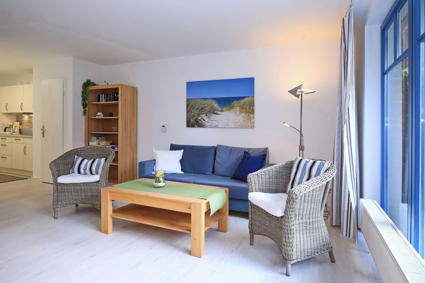 Vom Wohnbereich aus gelangst du direkt auf die Terrasse mit Strandkorb und weiteren Möbeln. Im Wohnzimmer befindet sich die hochwertige und leicht ausziehbare Schlafcouch (160 x 200 cm) auf der auch zwei Personen übernachten können, sowie der helle Essbereich.