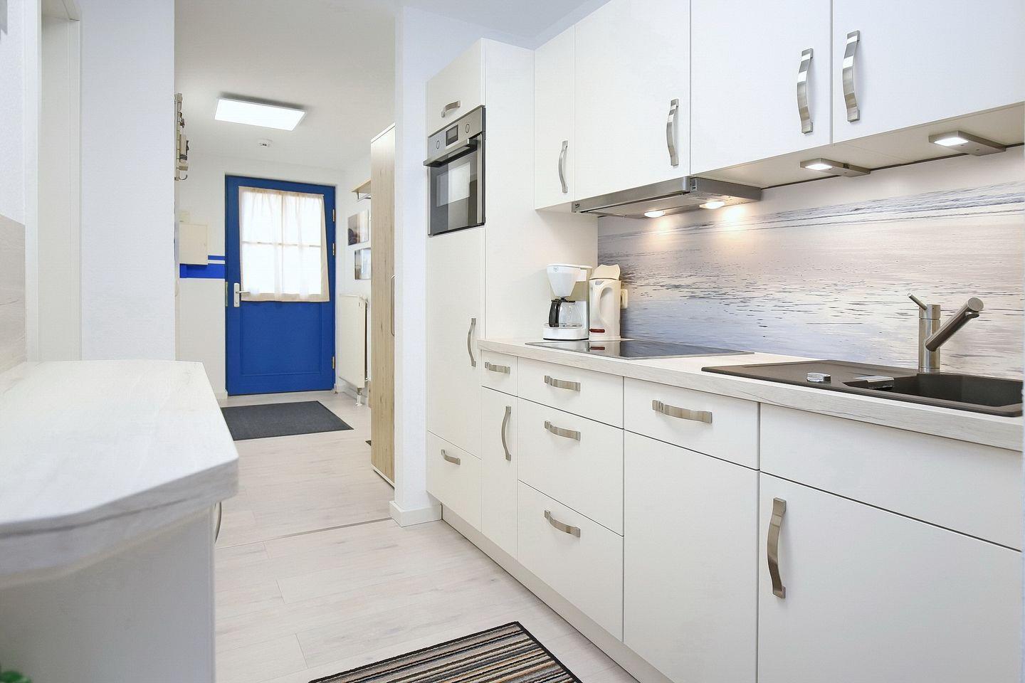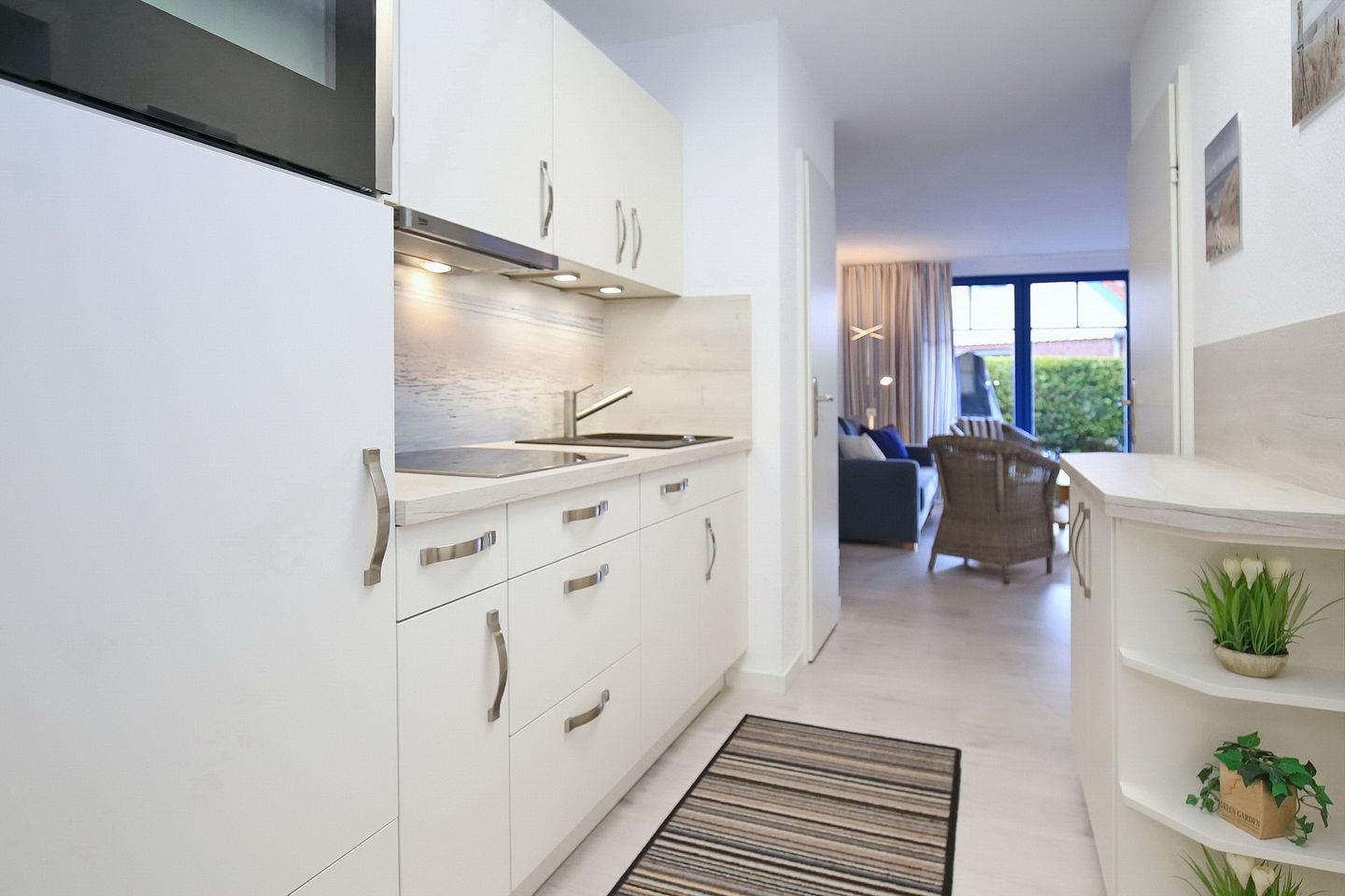 Die integrierte Küchenzeile ist voll ausgestattet mit einem modernen Hochbaubackofen mit integrierter Mikrowelle, einem Cerankochfeld, einem Kühlschrank mit Gefrierfach sowie einem Geschirrspüler. In den Schränken ist neben ausreichend Geschirr noch Platz für deinen persönlichen Bedarf.