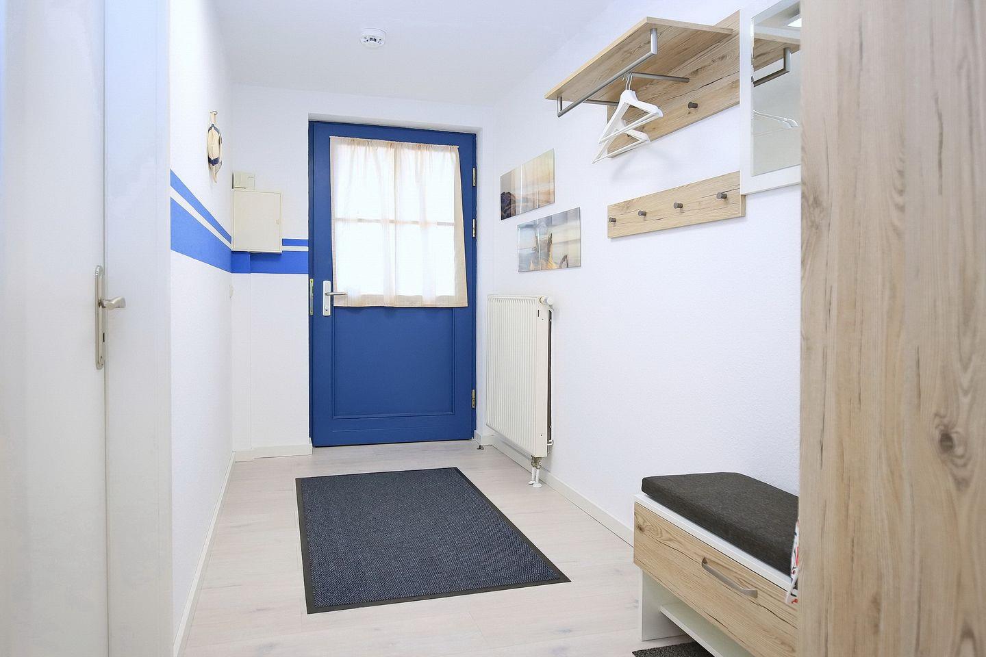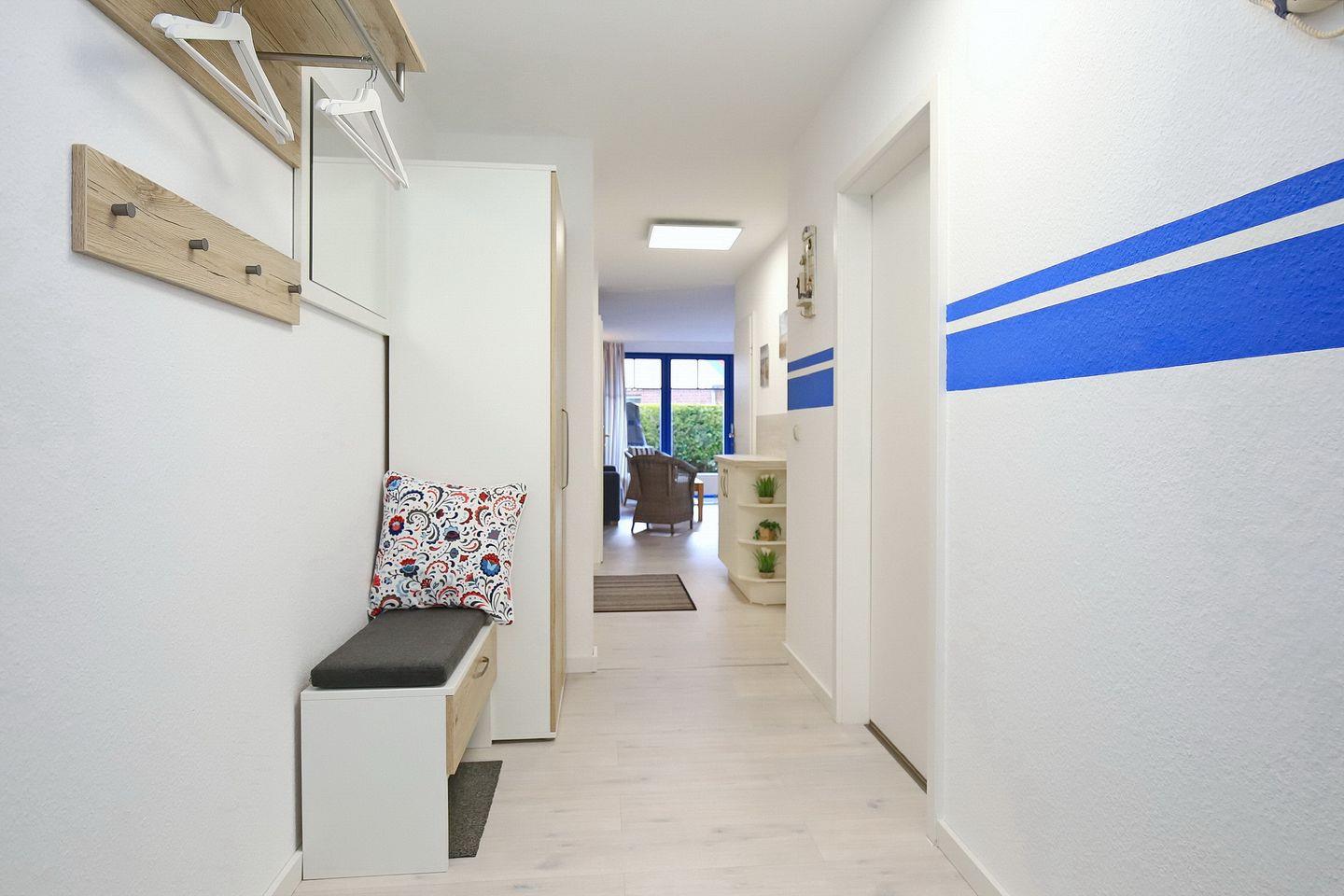 Im Eingangsbereich erwartet dich eine moderne Garderobe mit ausreichend Haken in verschiedenen Höhen, einen Spiegel, sowie eine Sitzgelegenheit und ein Schrank.