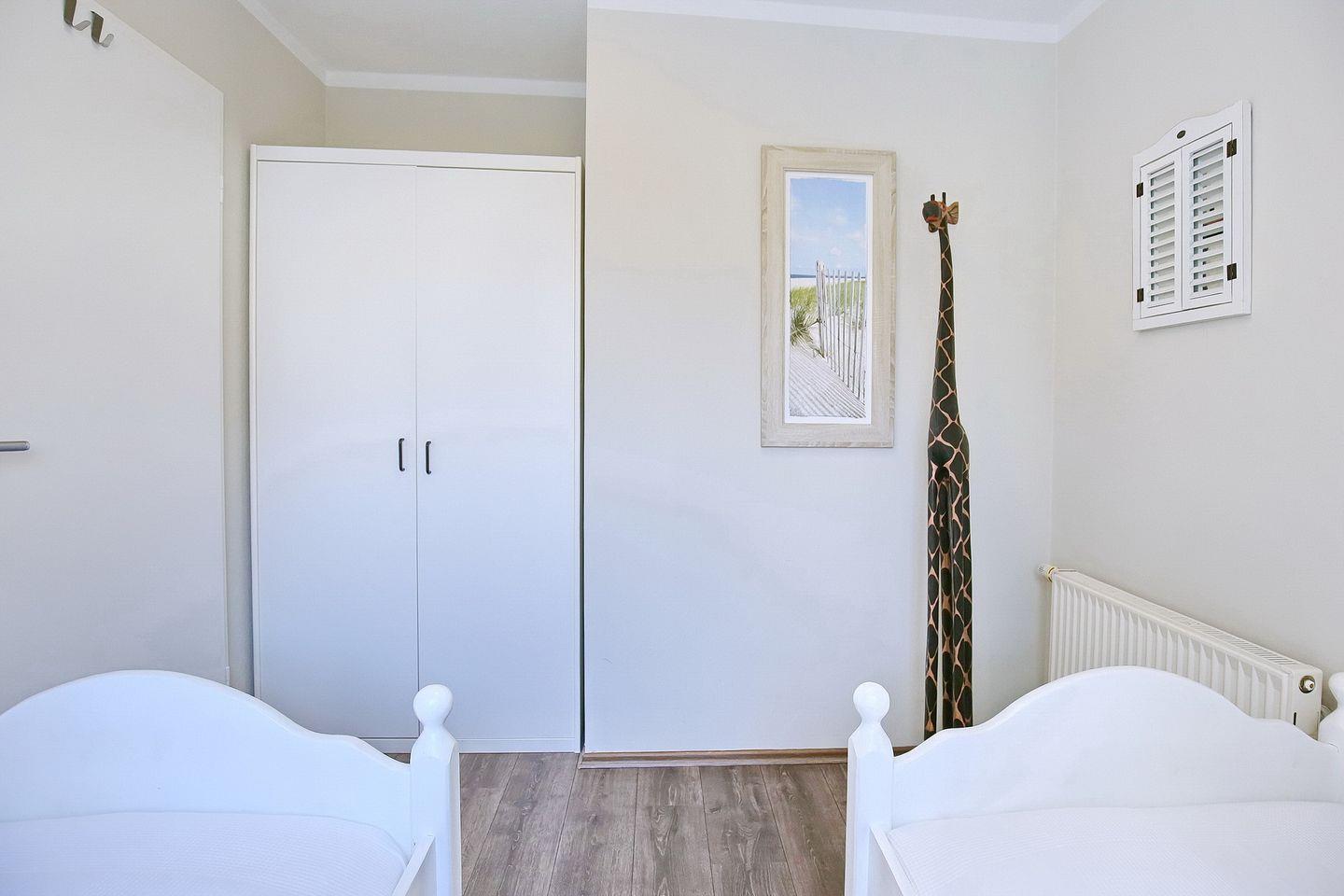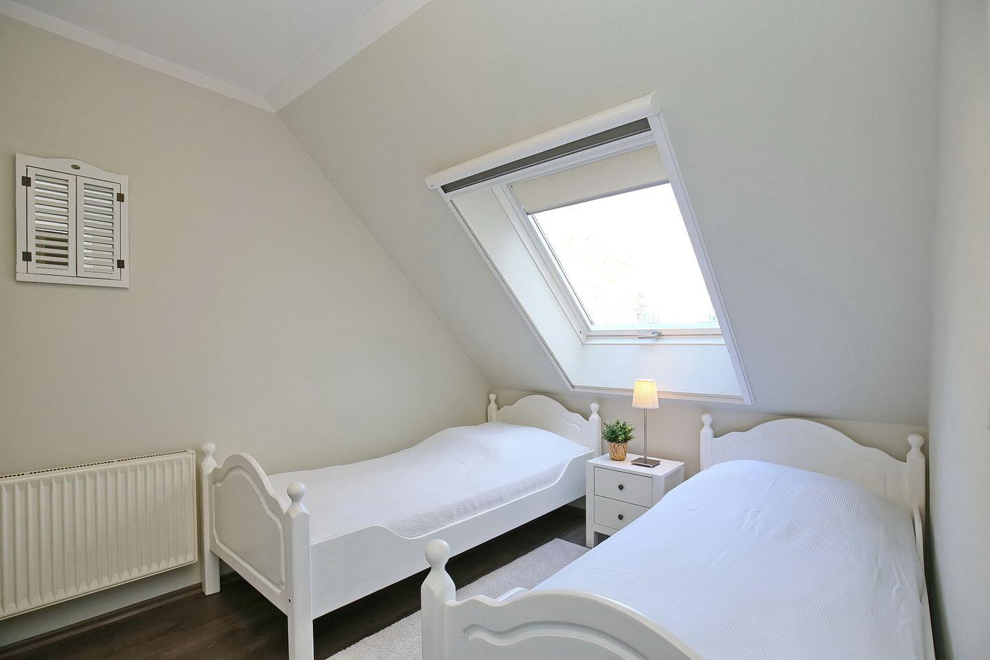 Die oberen Schlafzimmer schaffen mit jeweils einem komfortablem Doppelbett (2 x 90 x 200 cm) und einem Kleiderschrank eine wohnliche Atmosphäre. Im unteren Schlafzimmer stehen zwei Einzelbetten (2 x 90 x200 cm) sowie ein Kleiderschrank. Zur Verdunklung wurden an den Fenstern Rollos angebracht. Ebenso sind Fliegenschutzgitter vorhanden. Der Boden wurde in allen Schlafräumen mit Laminat und flauschigen Läufern ausgelegt.