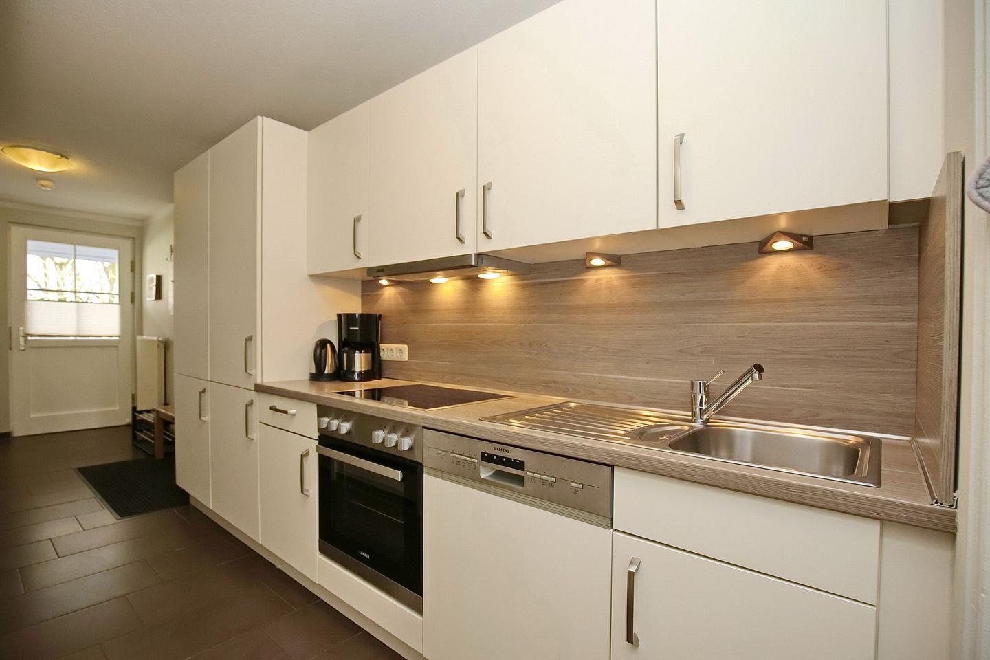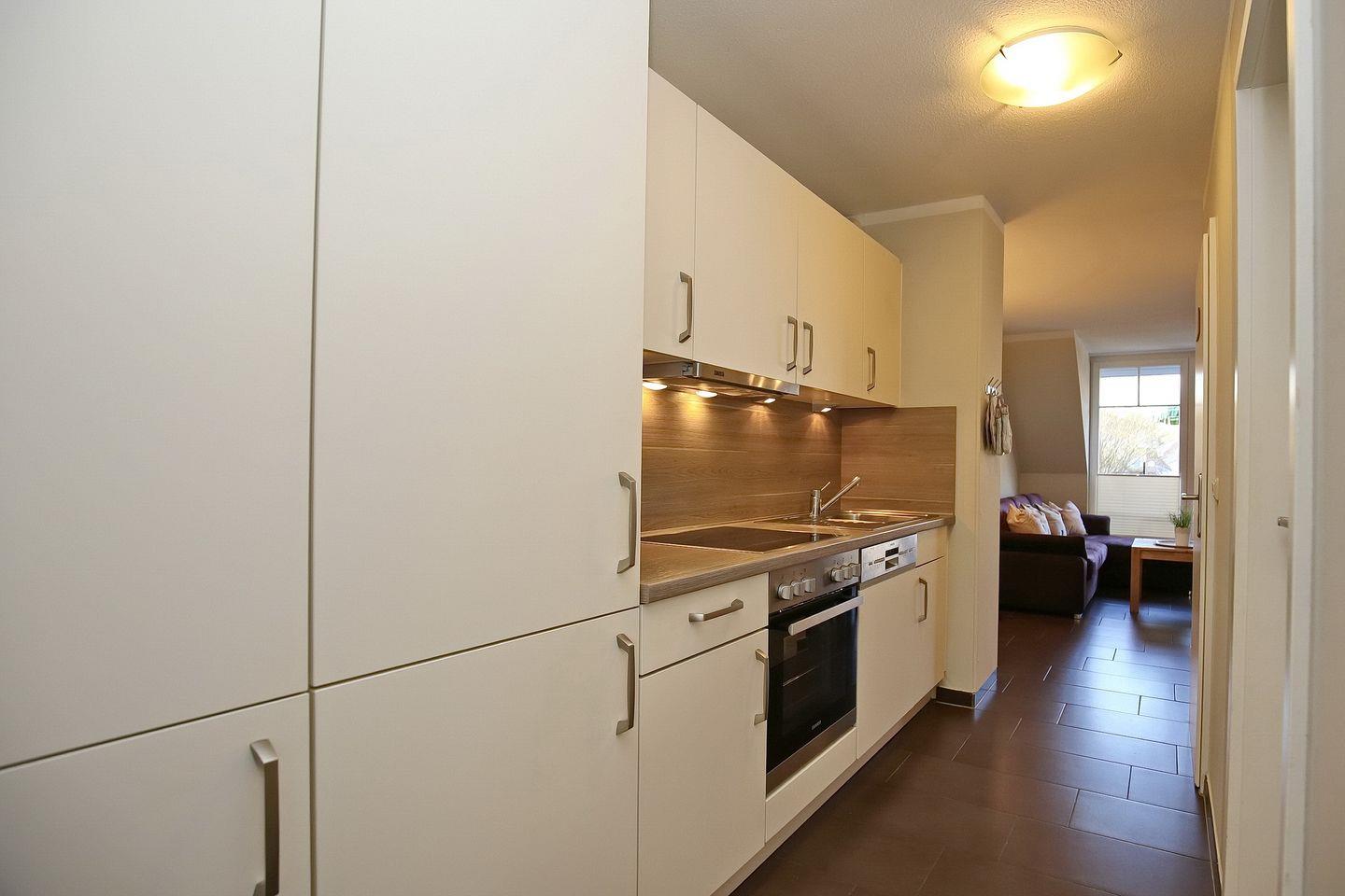 Die integrierte Küchenzeile ist mit einem 4-Platten-Cerankochfeld, einem Backofen, einem Geschirrspüler und einem Kühlschrank mit Gefrierfach sowie einer Mikrowelle ausgestattet. Als Bodenbelag wurde im Wohn- und Küchenbereich Fliese gewählt.